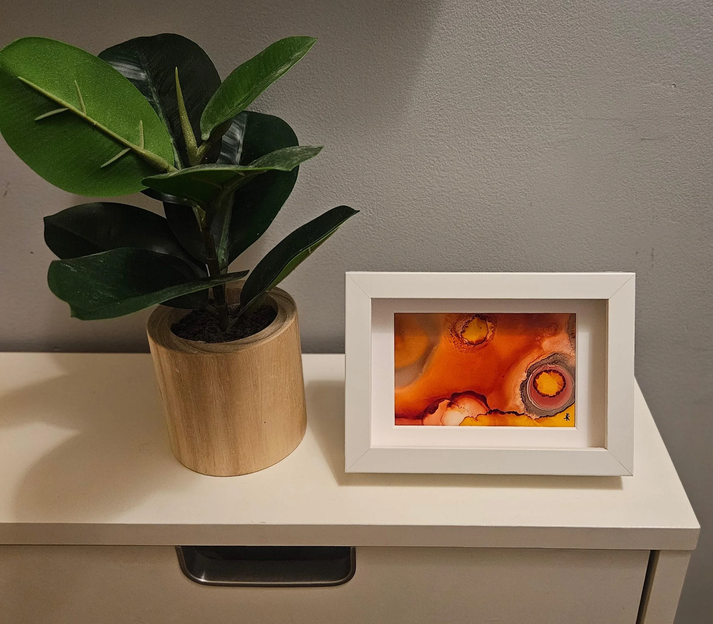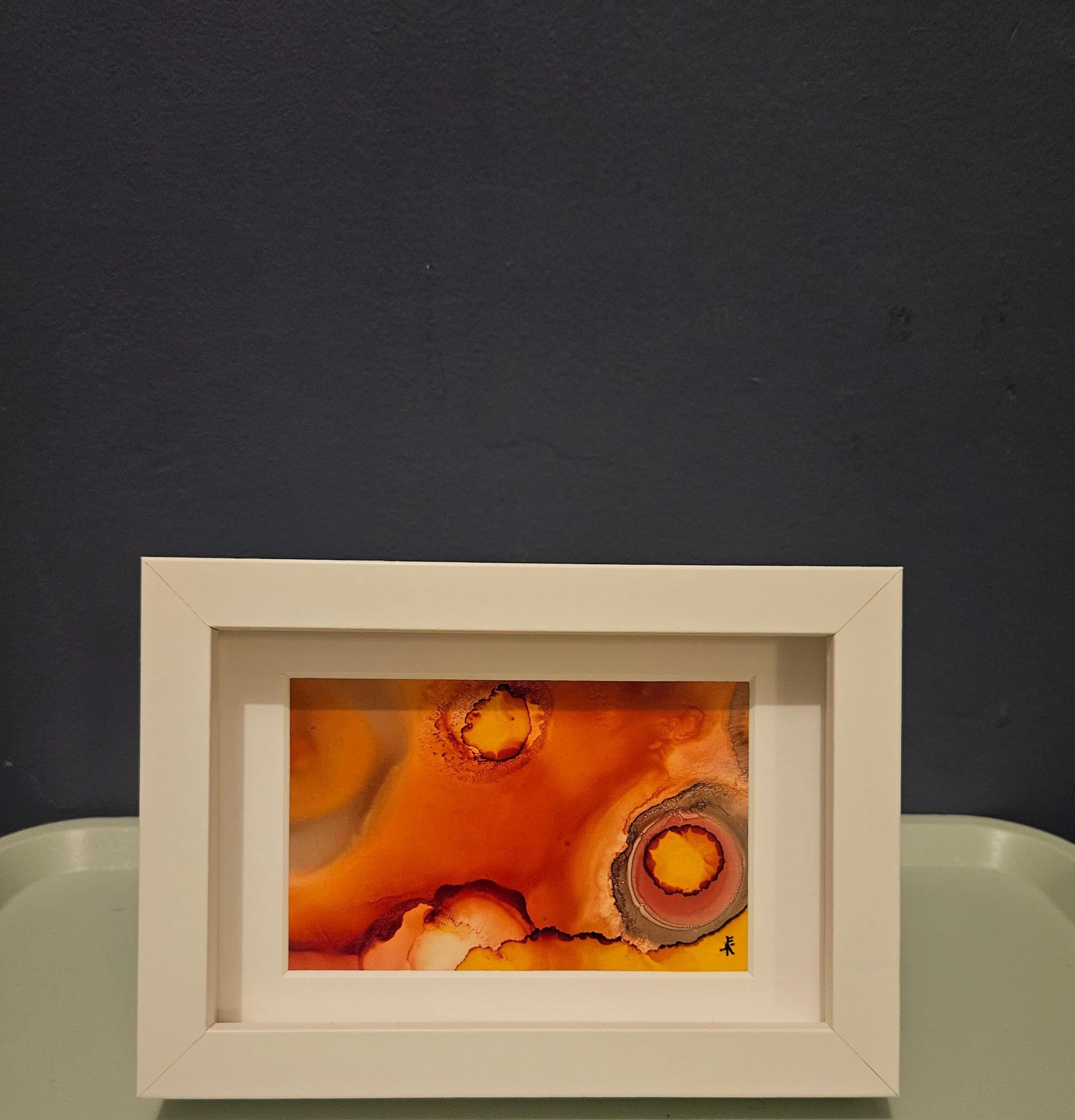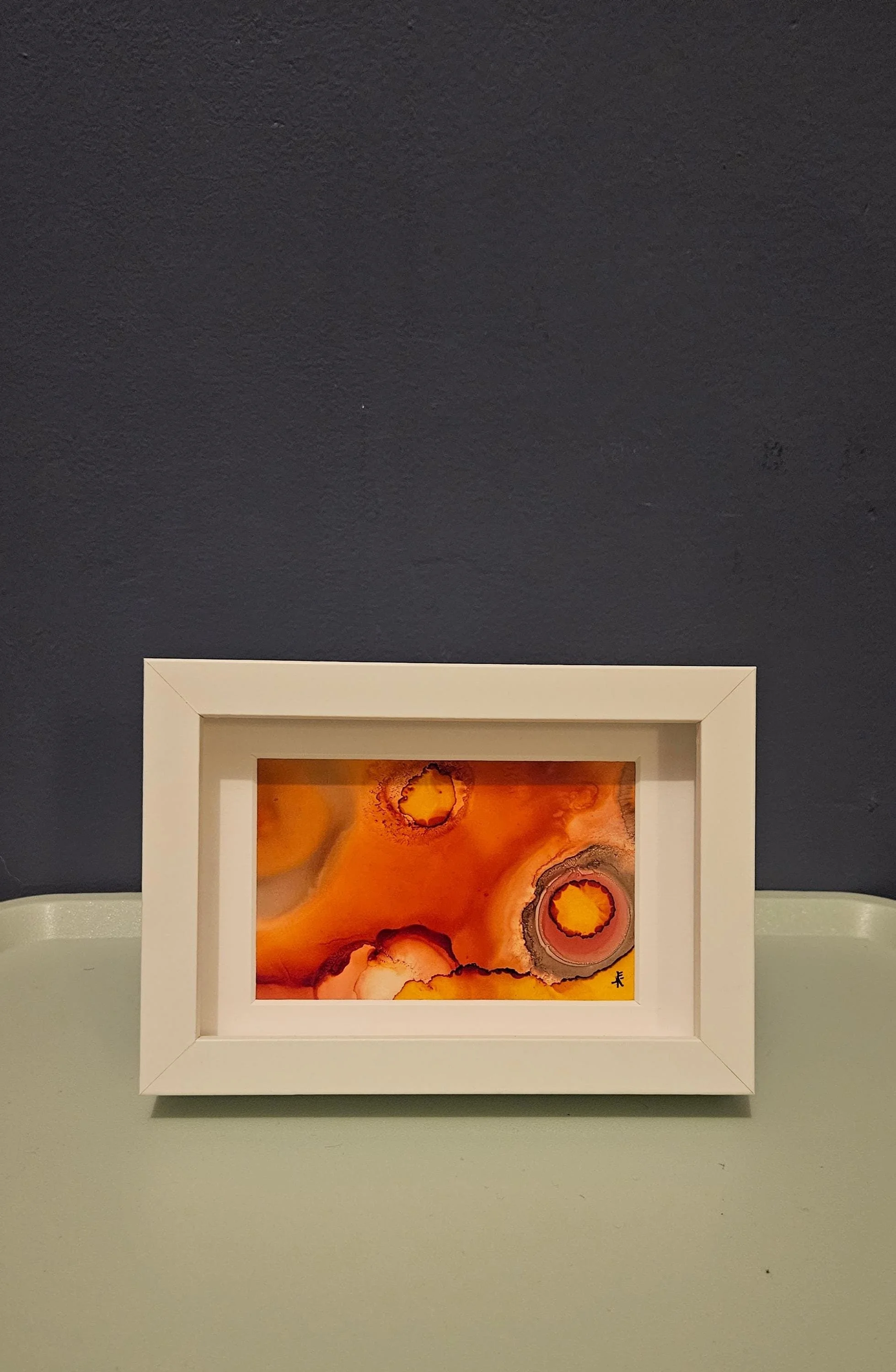 Acorn- a vibrant, abstract, painting made with alcohol inks on a rectangular, white frame. Reds, oranges, and yellows. Ready to display