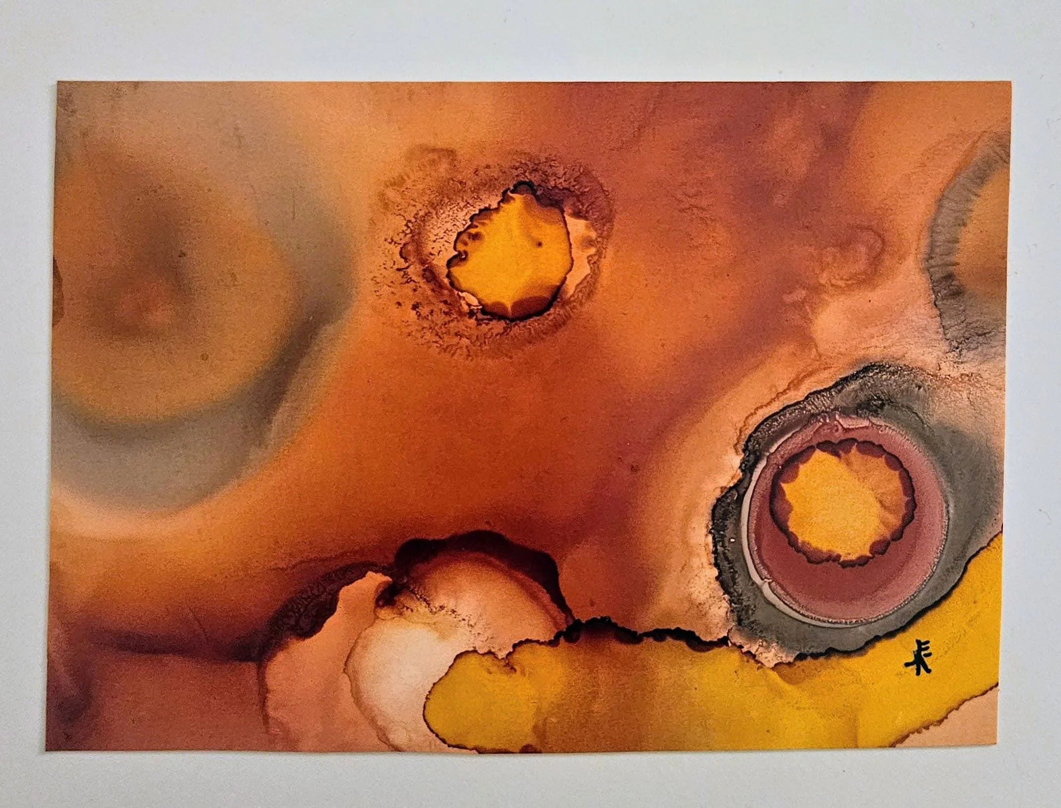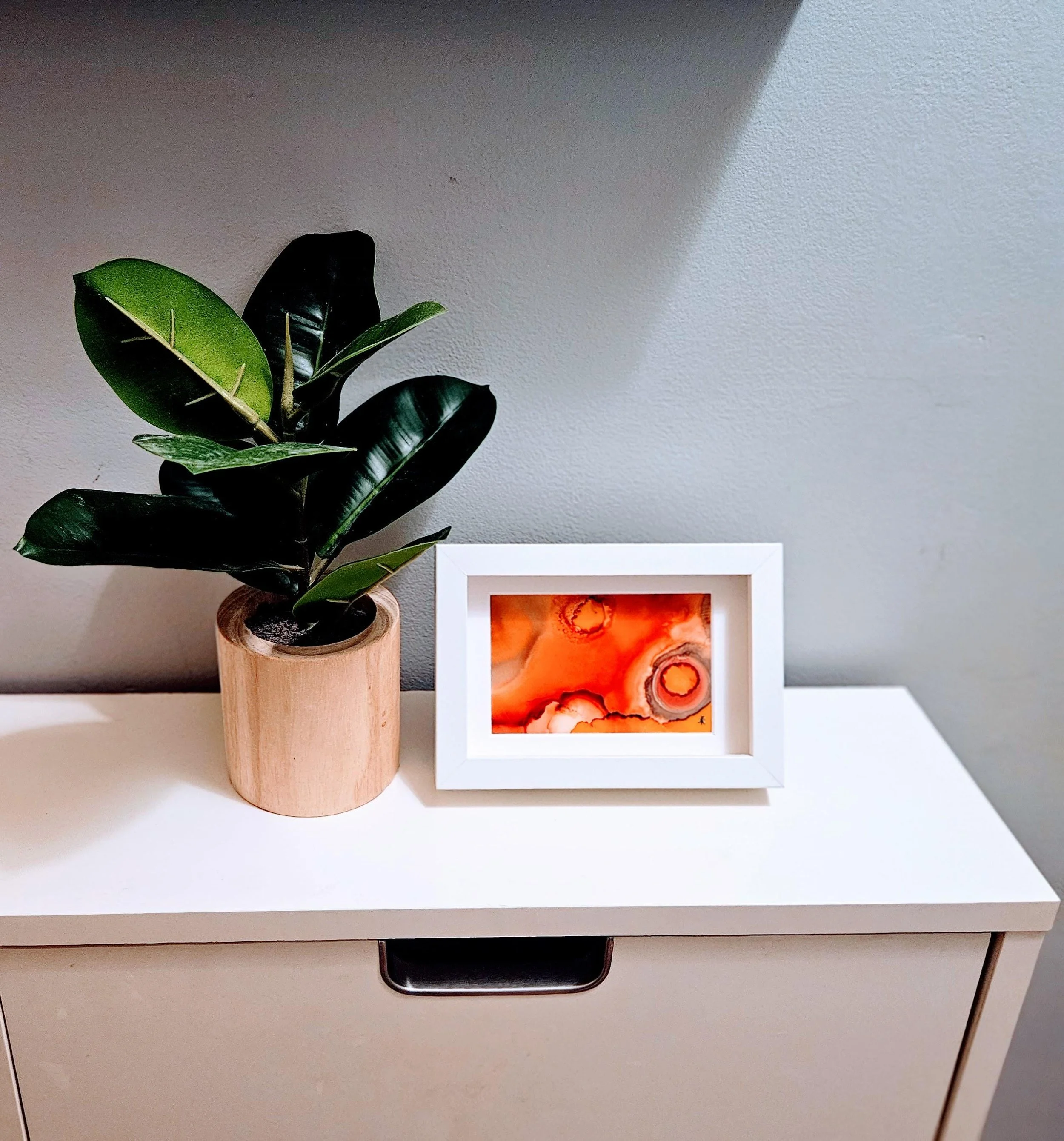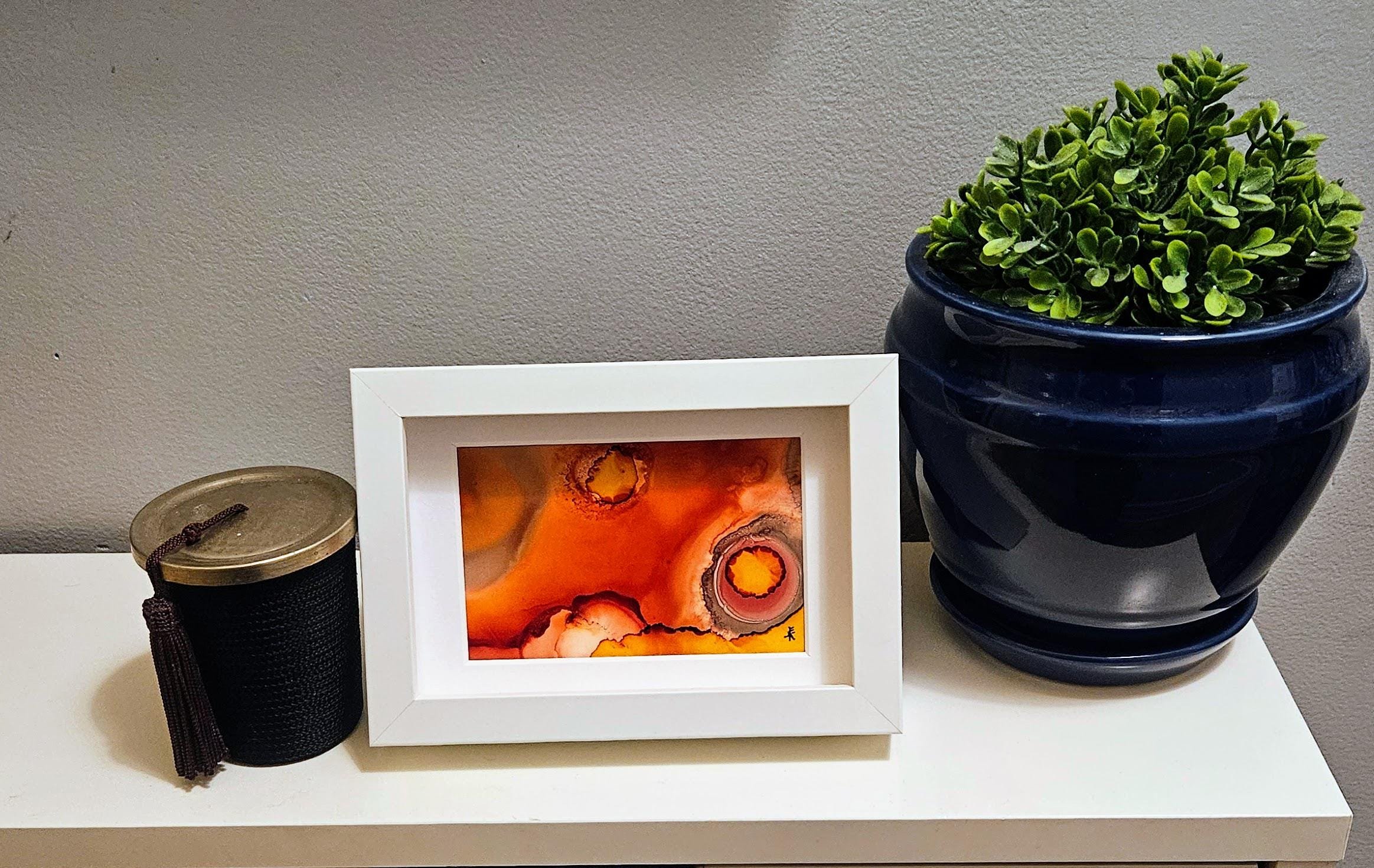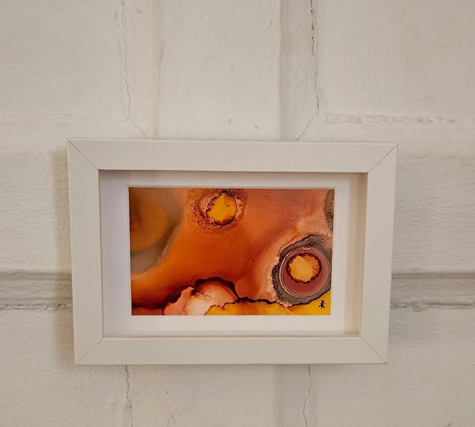 Acorn- a vibrant, abstract, painting made with alcohol inks on a rectangular, white frame. Reds, oranges, and yellows. Ready to display