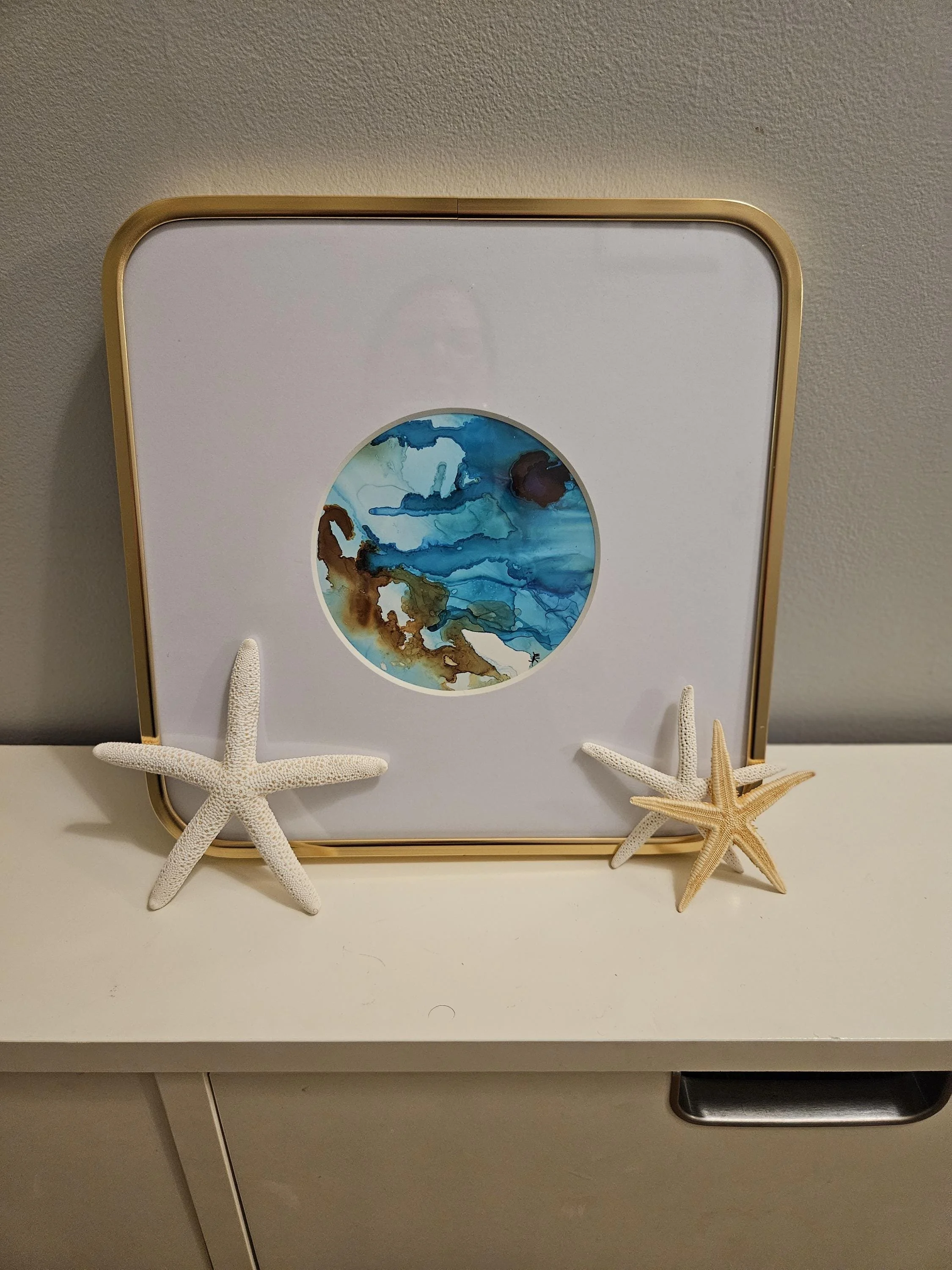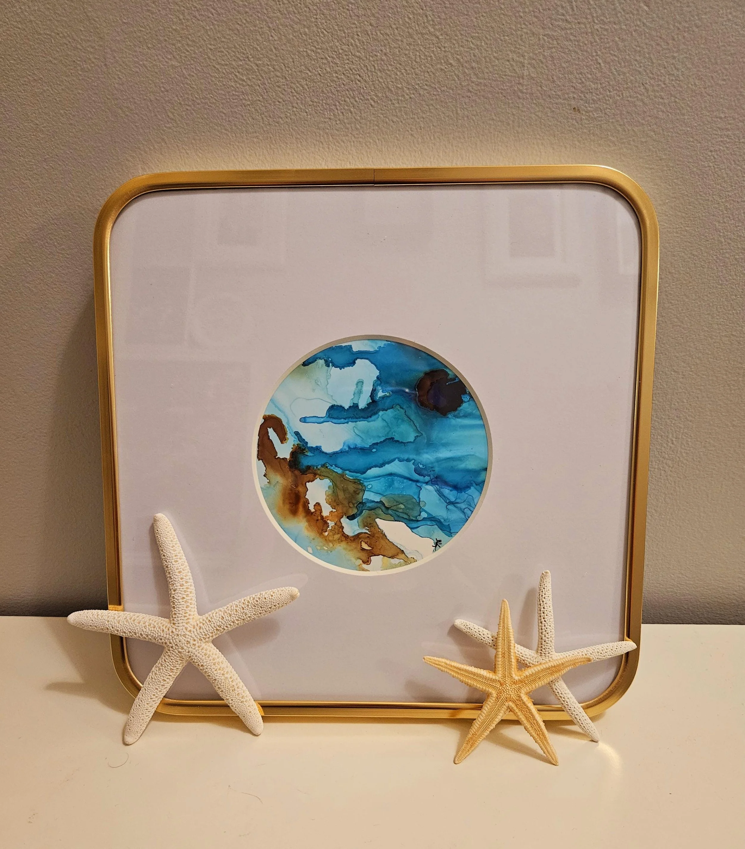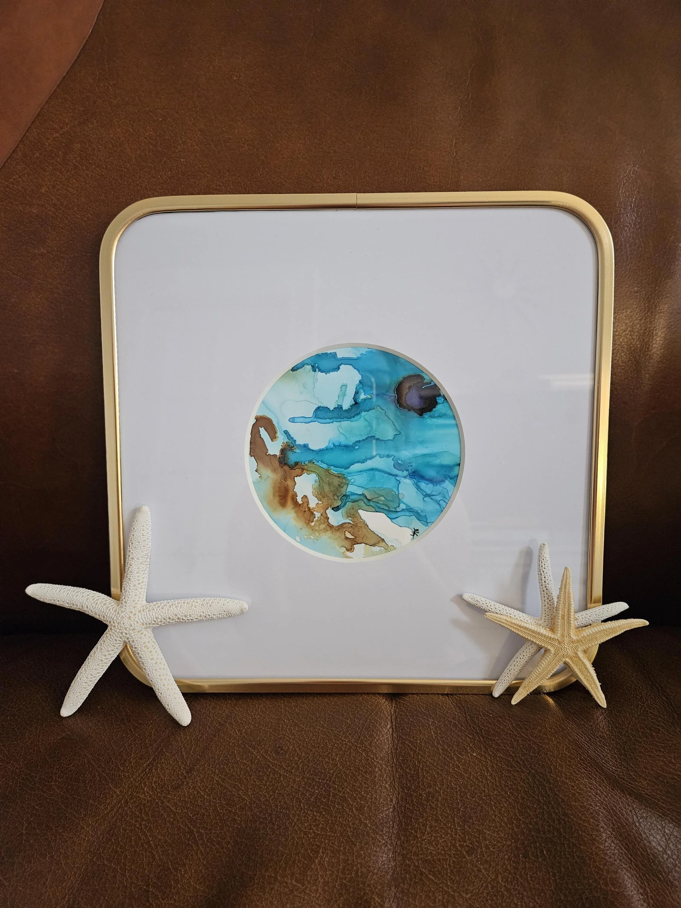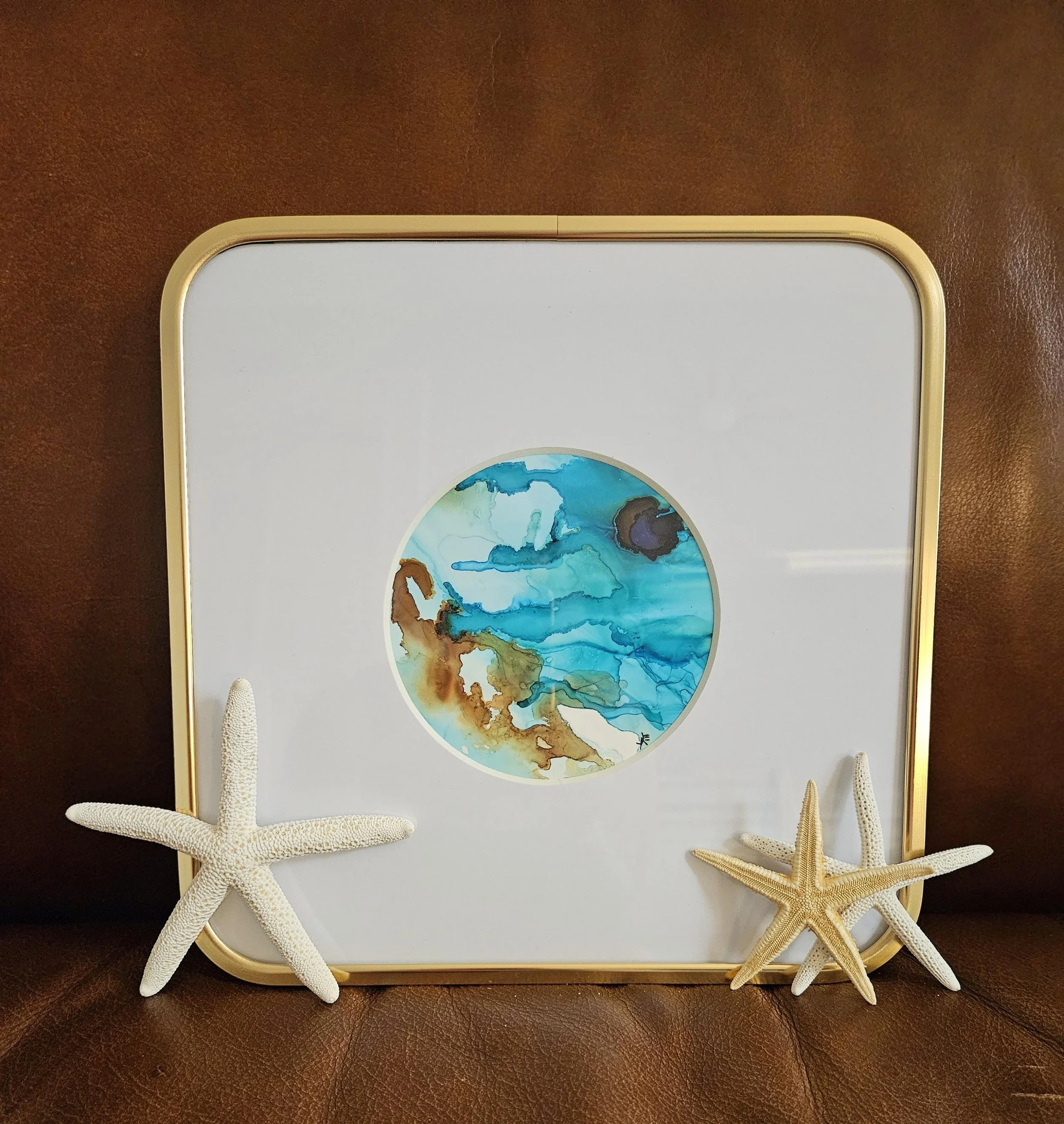 Coral- original abstract art in square gold frame. Made with alcohol inks, inspired by coral and the ocean. Aqua and brown