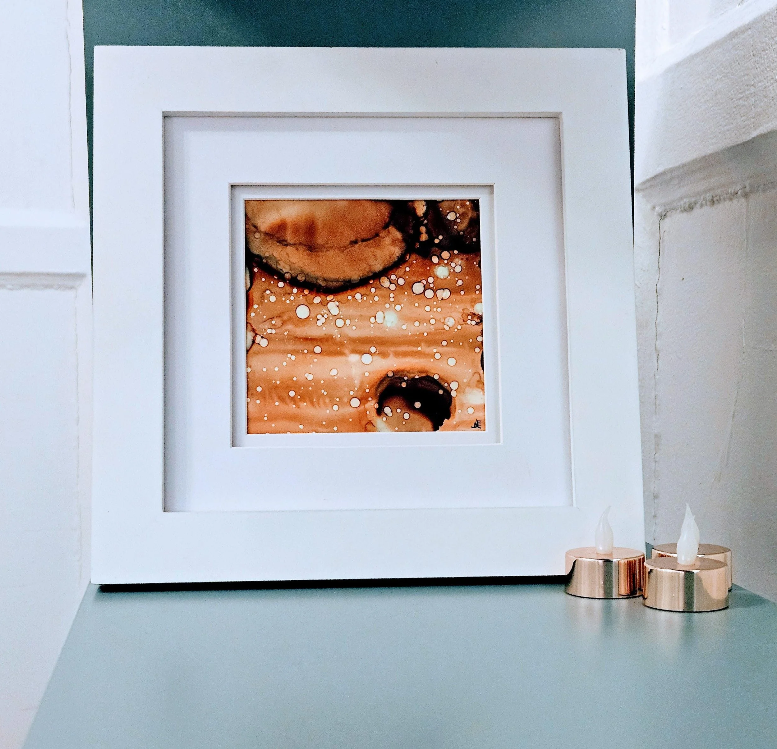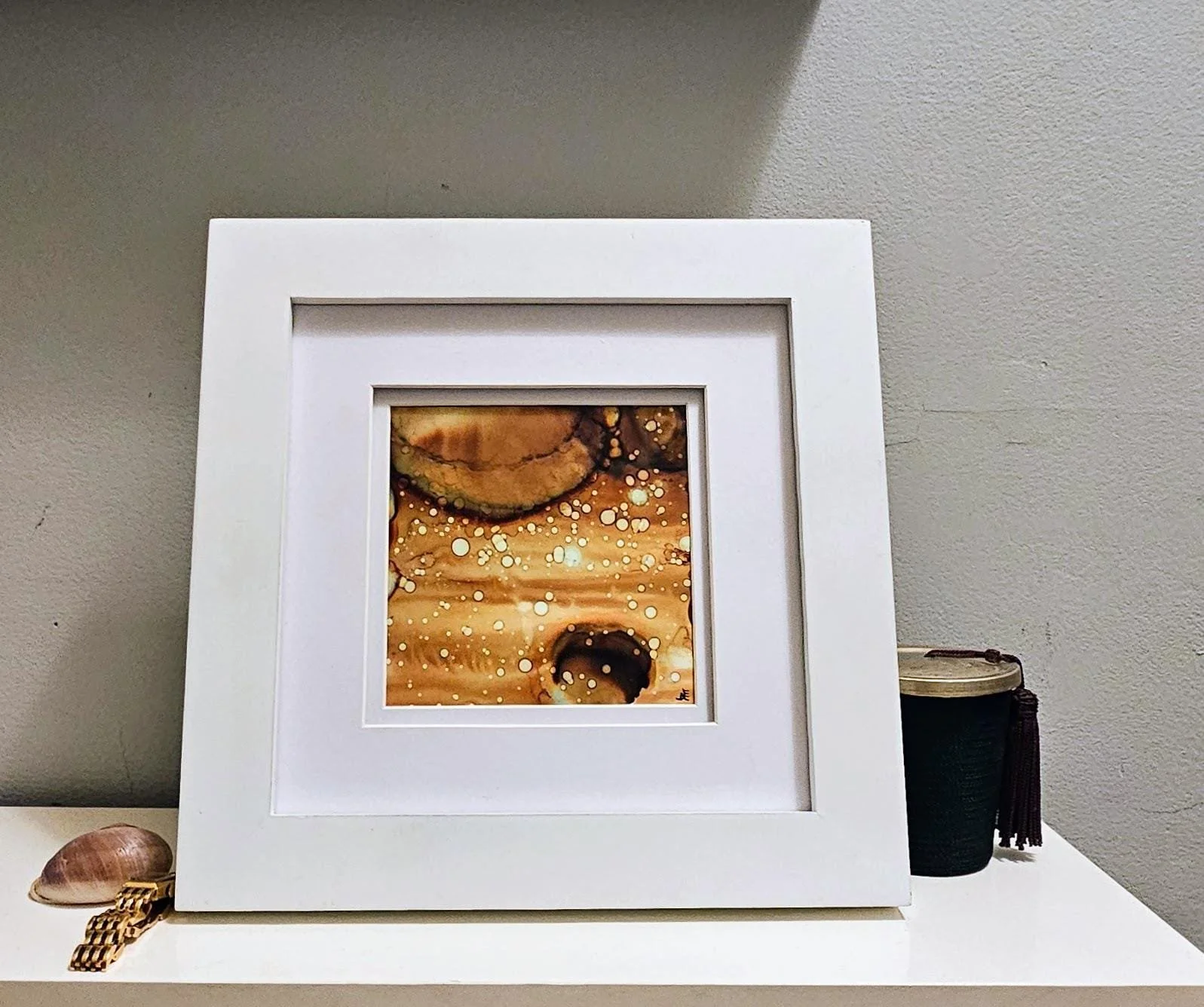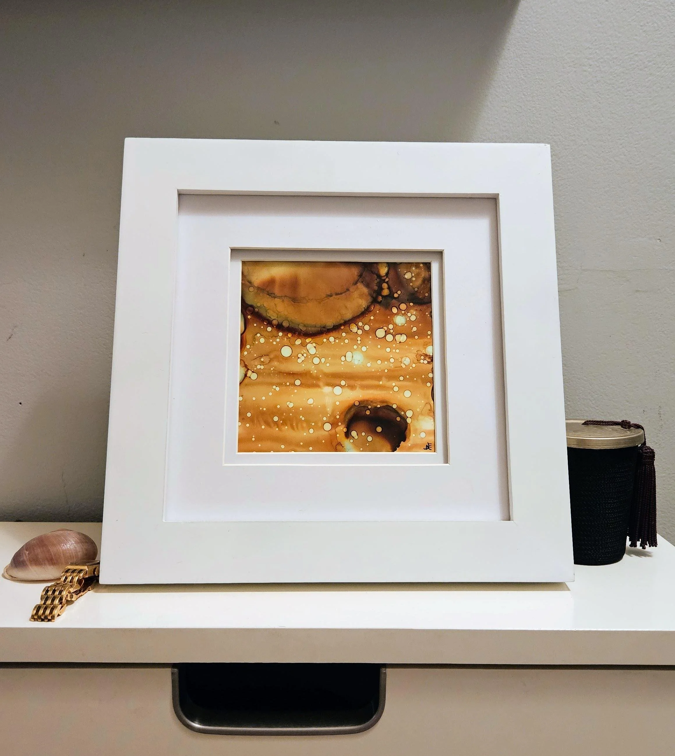 Cortadito- Brown, alcohol ink original painting in a white square frame 10"x10". Bring some warmth to your space. Inspired by Cuban coffee.