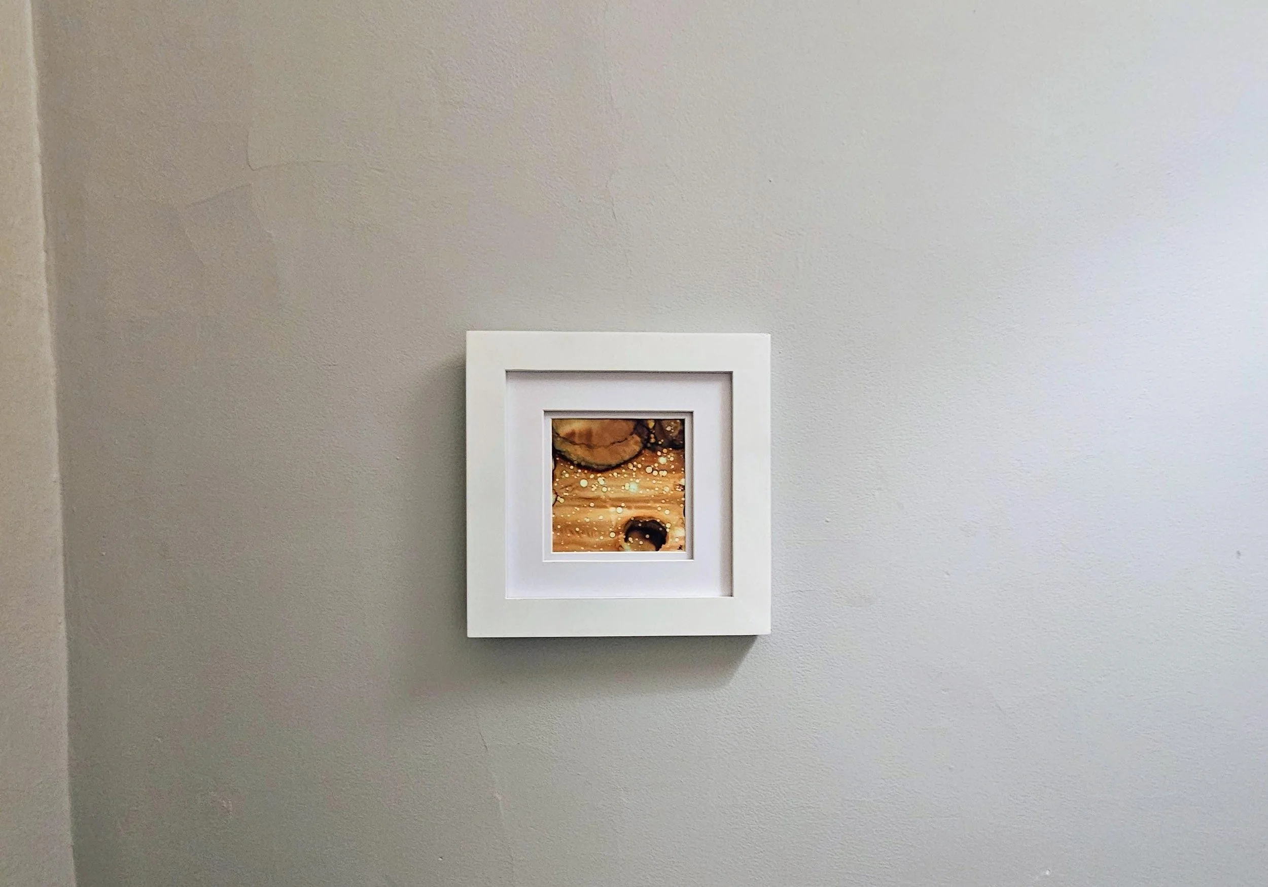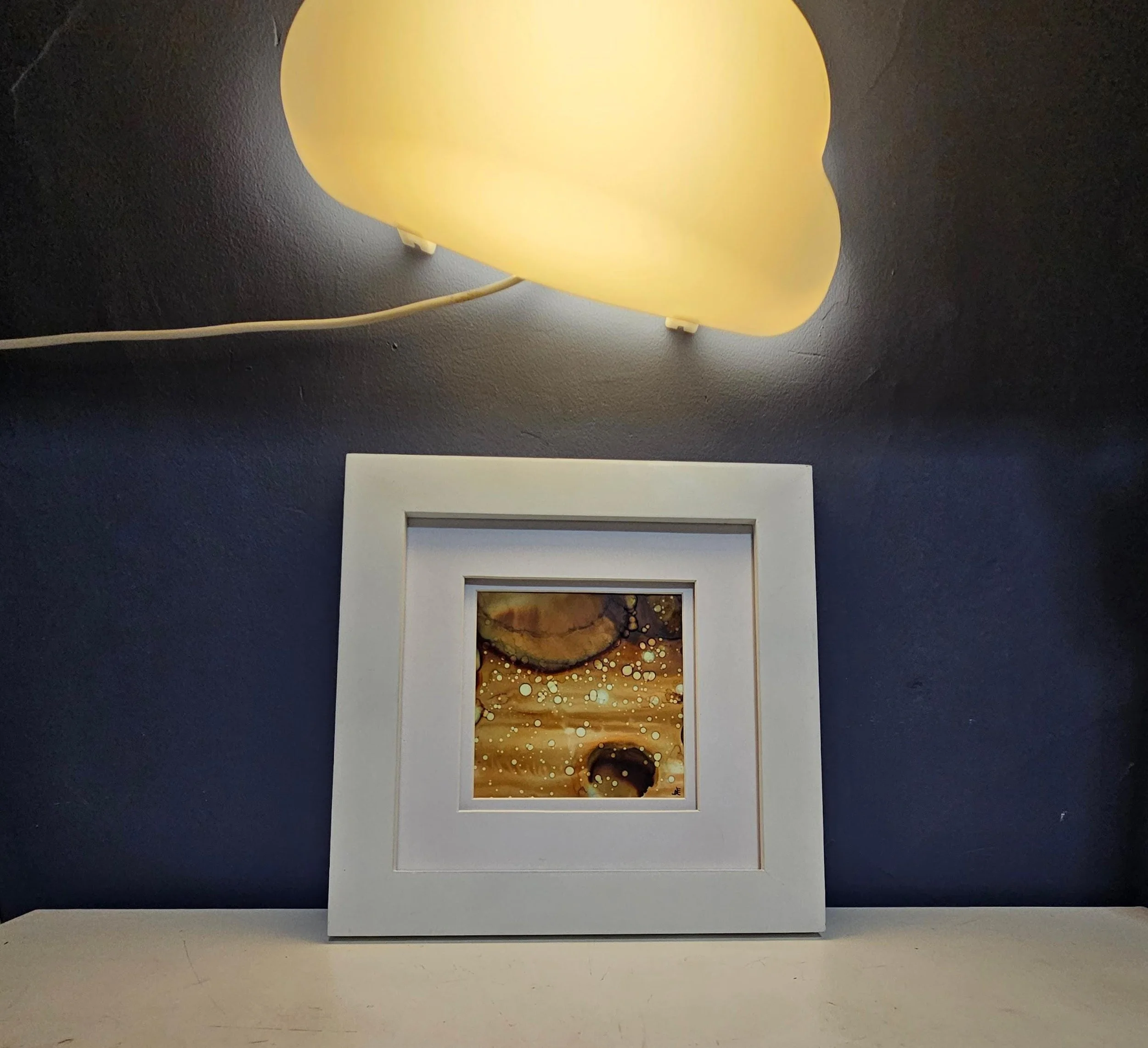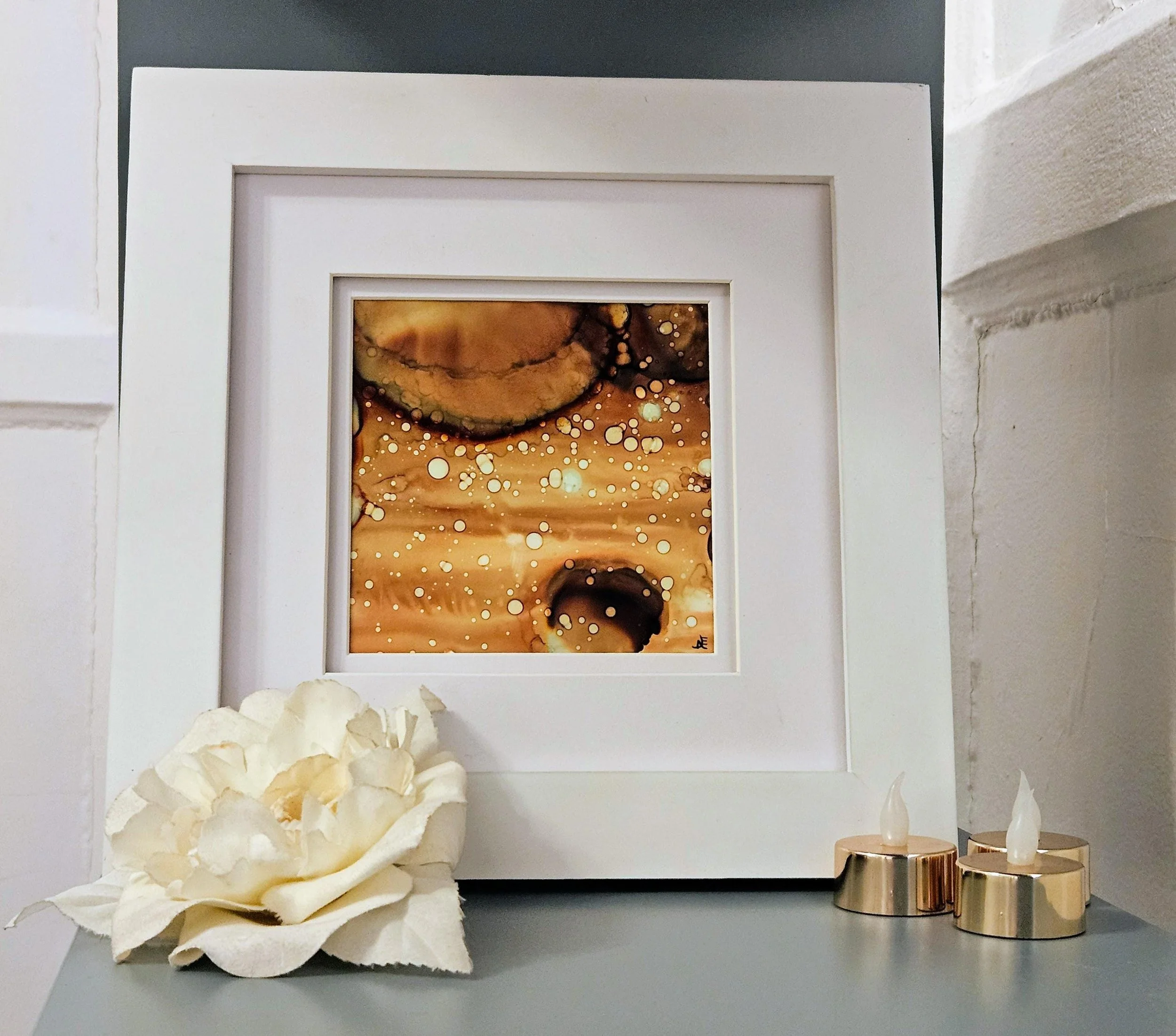 Cortadito- Brown, alcohol ink original painting in a white square frame 10"x10". Bring some warmth to your space. Inspired by Cuban coffee.