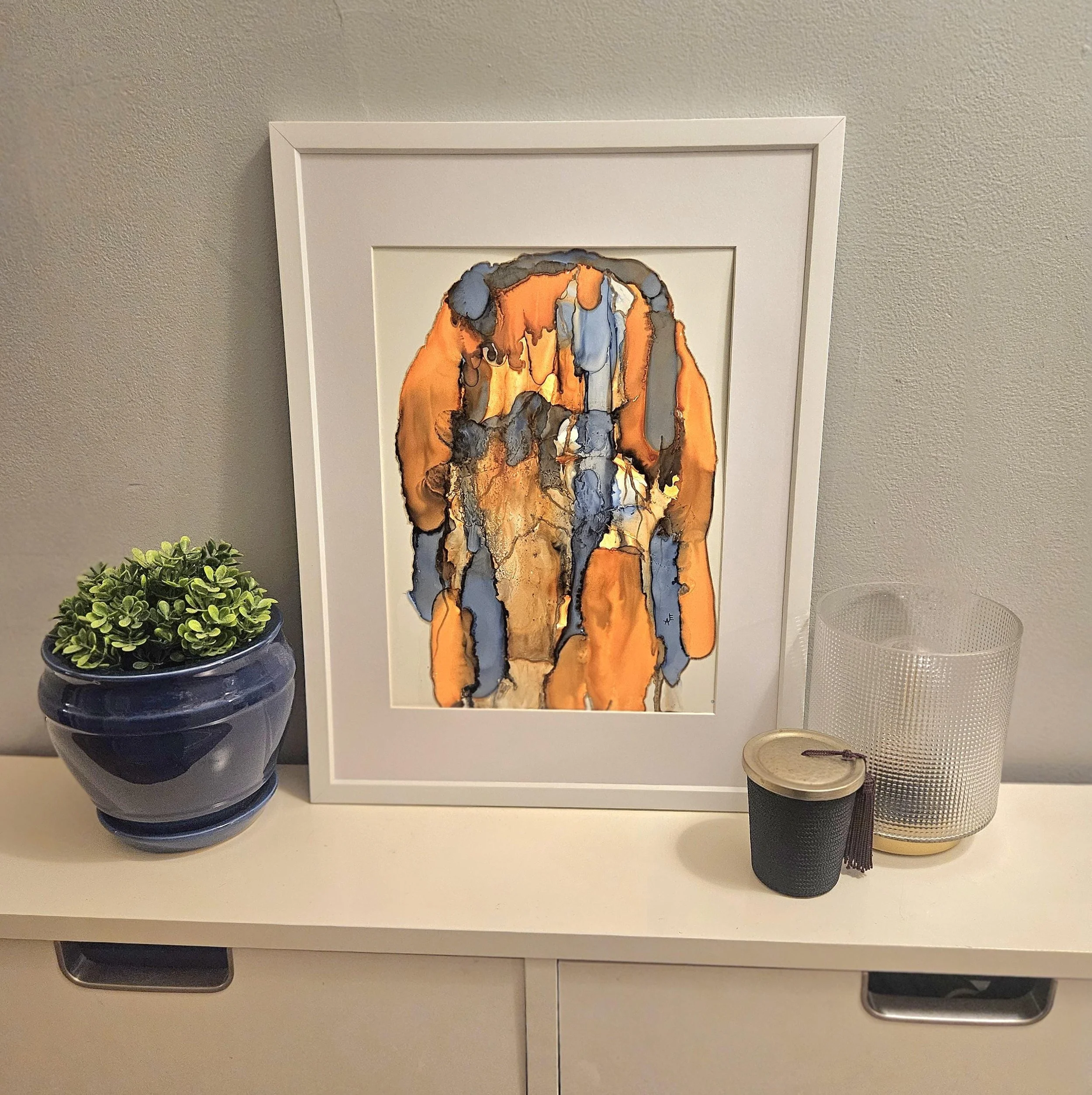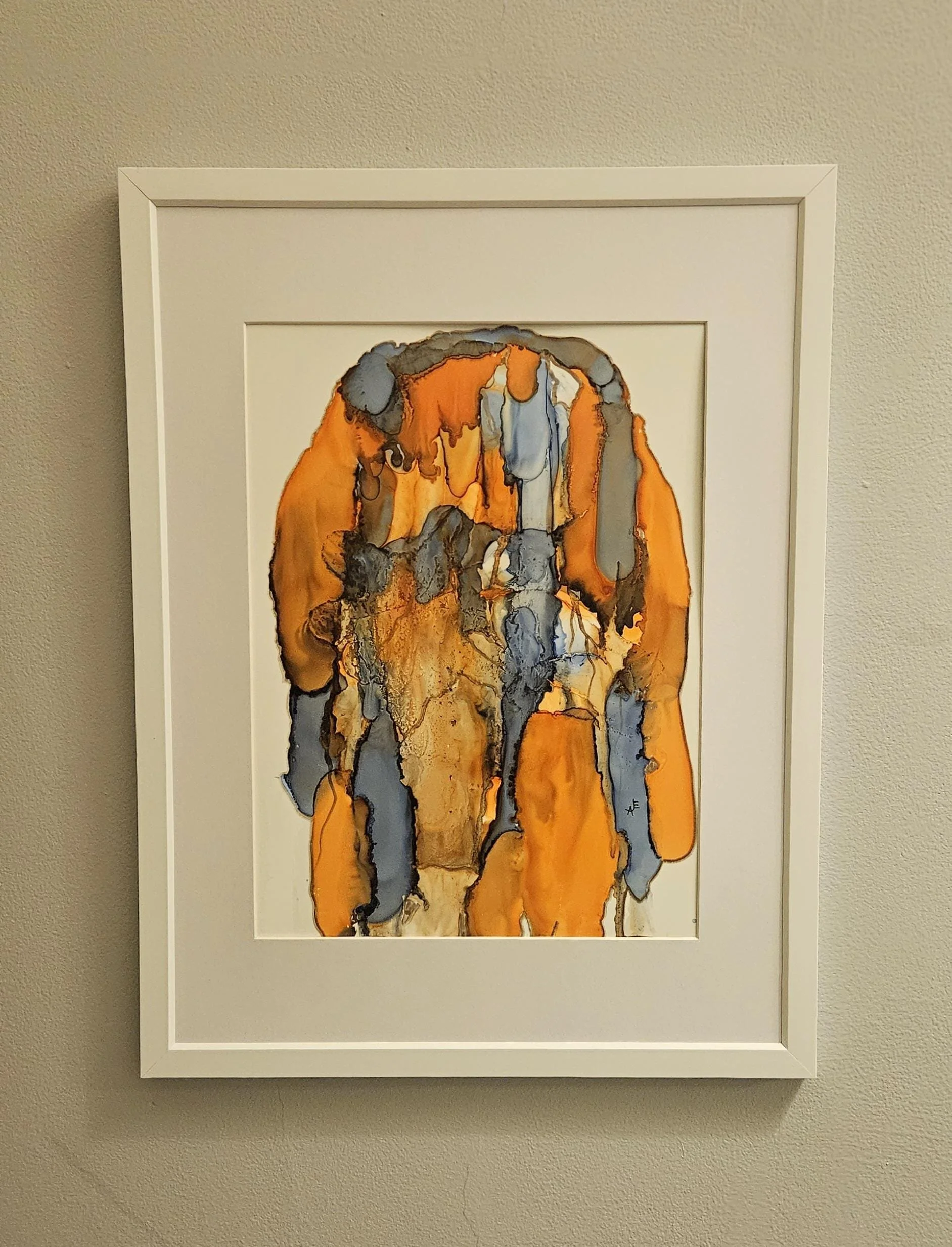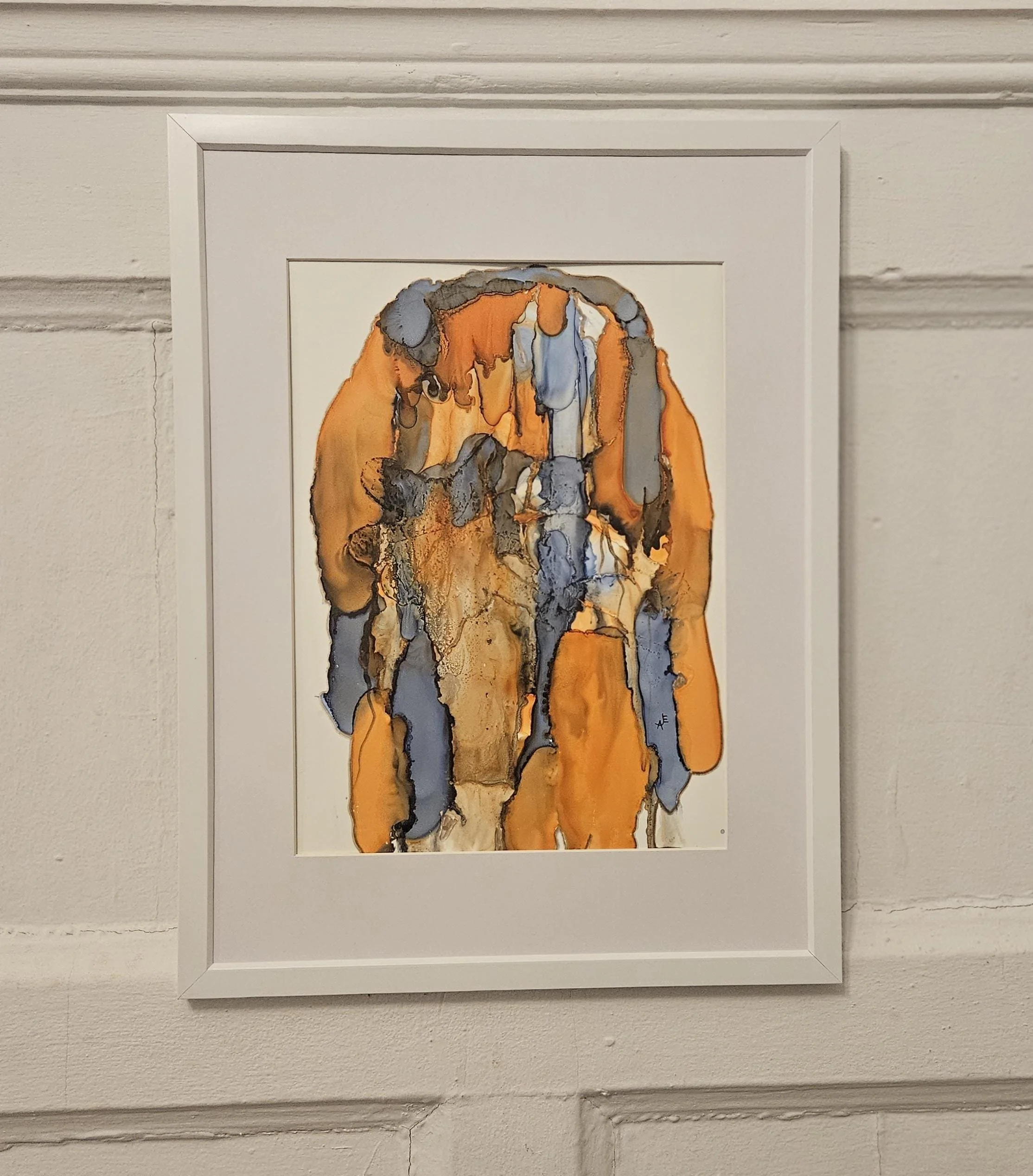 Falling Dusk- alcohol inks, oranges, blues, moody, drippy painting in a white, mated frame. Bring some color to your space. 16" x 12"