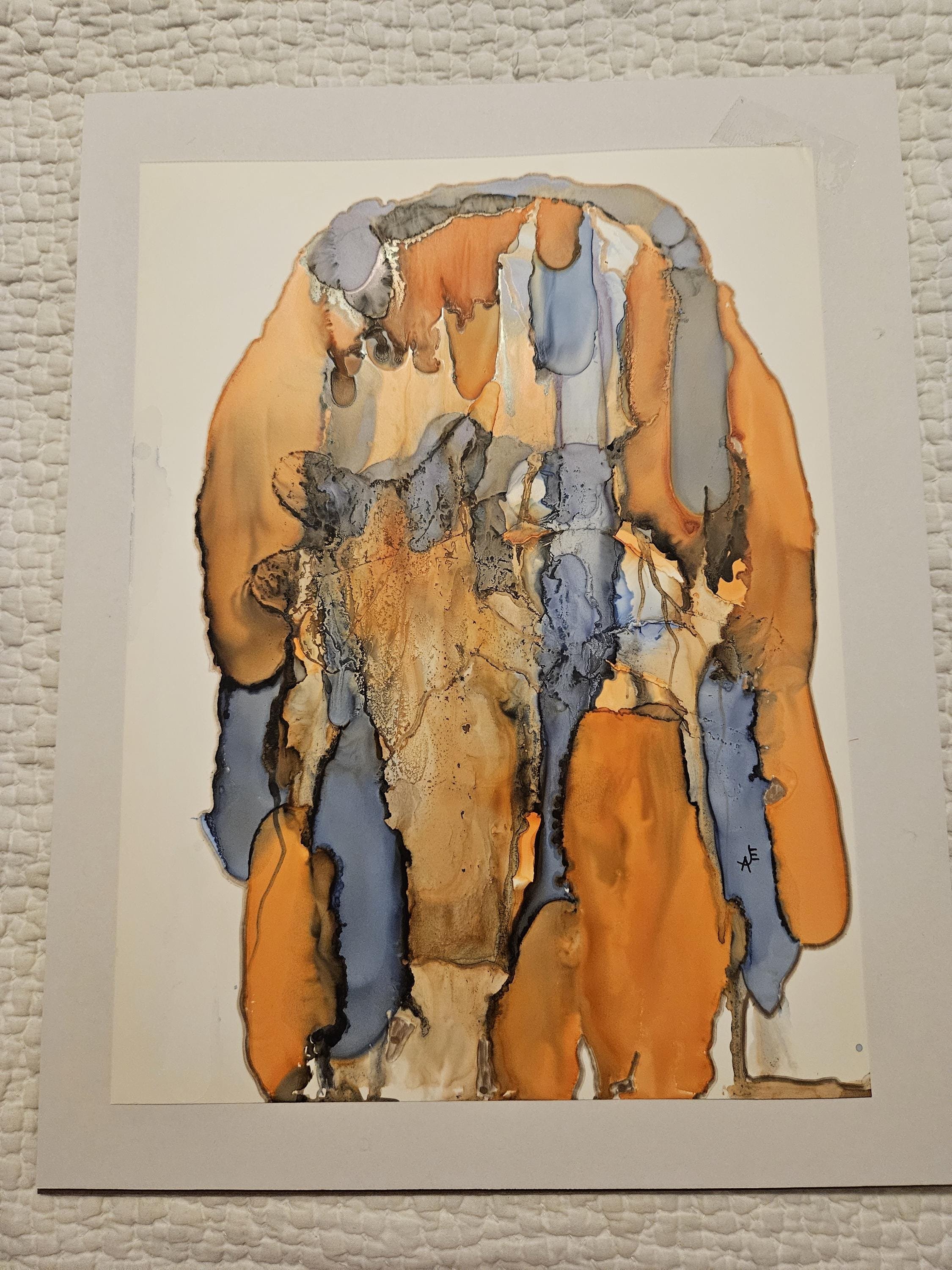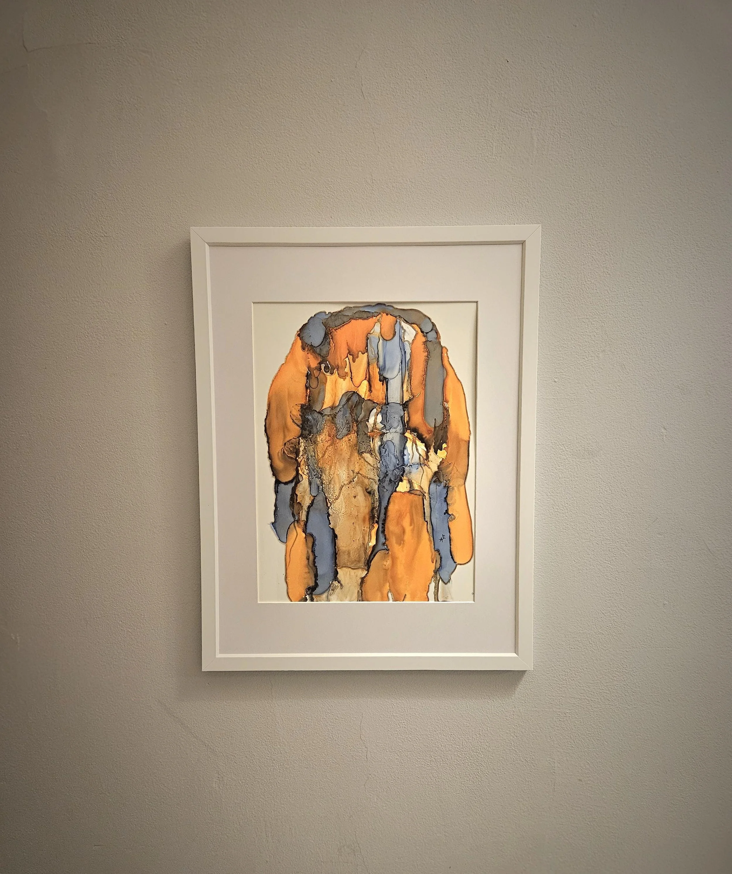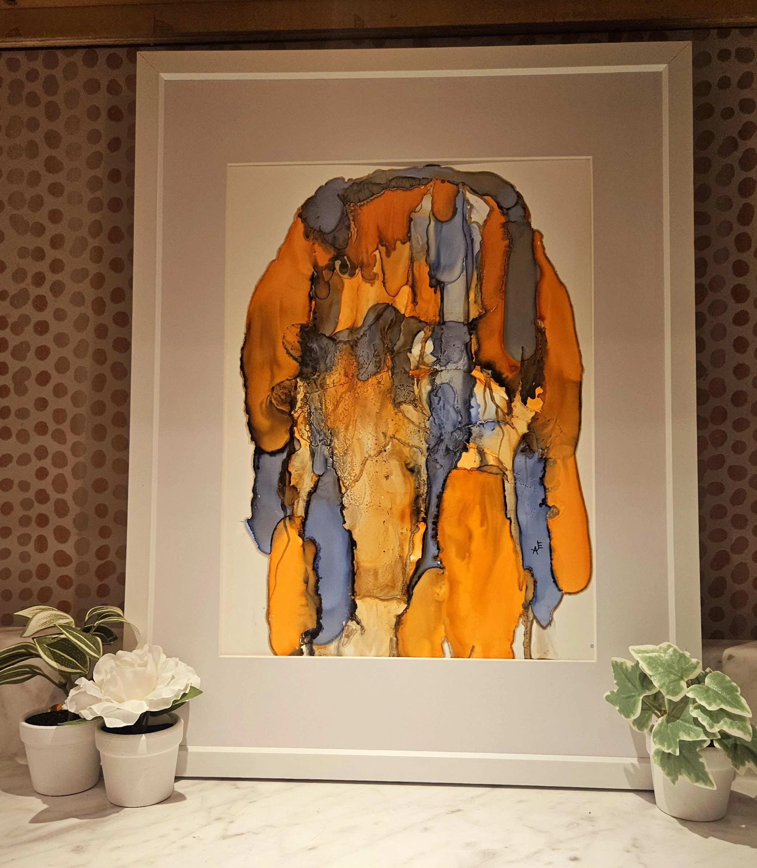 Falling Dusk- alcohol inks, oranges, blues, moody, drippy painting in a white, mated frame. Bring some color to your space. 16" x 12"