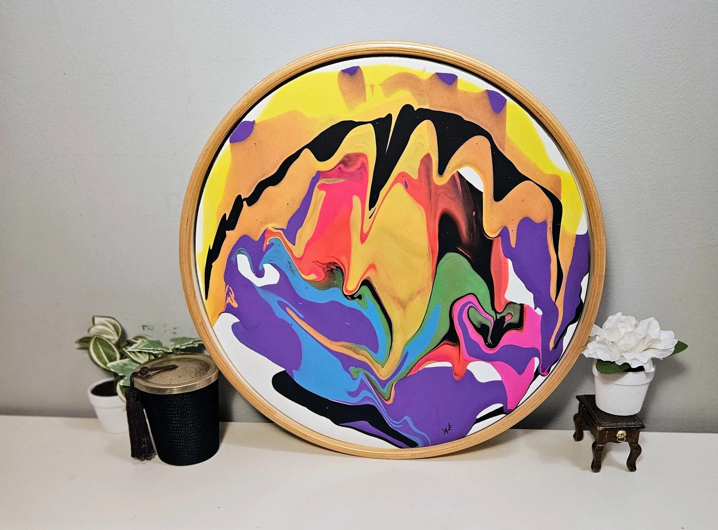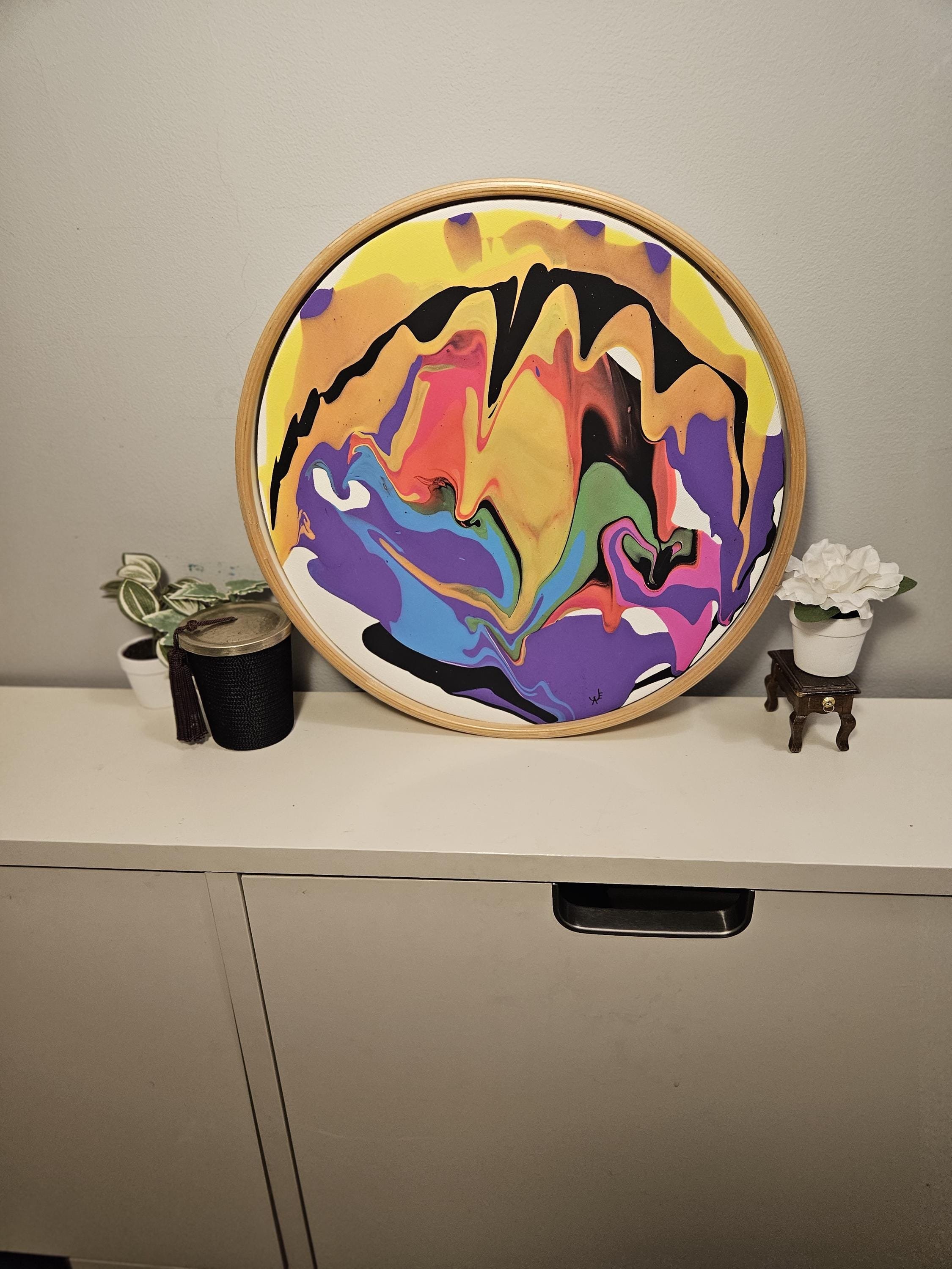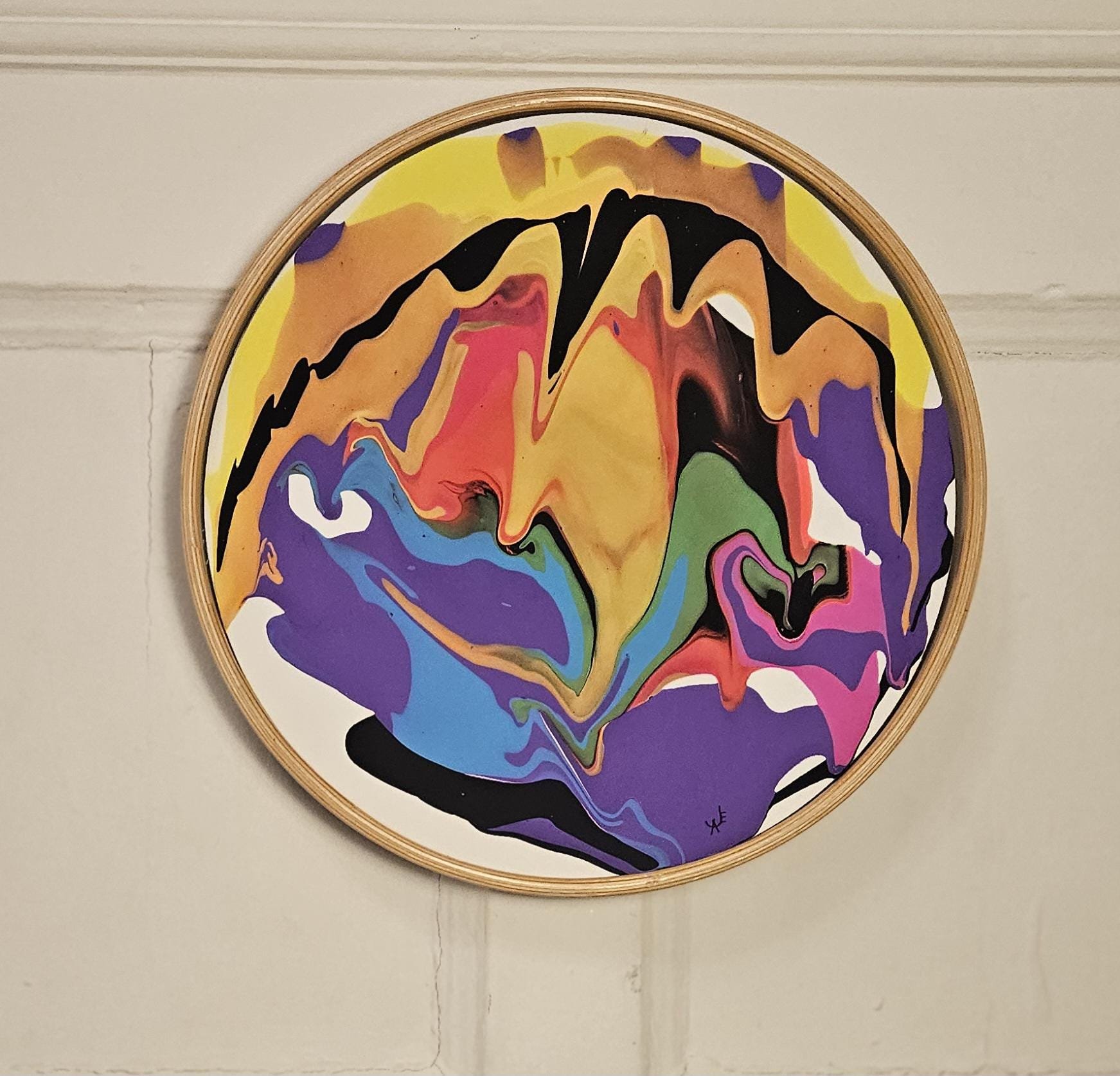 Add a bold statement piece to your space with this one-of-a-kind circular abstract painting! Created using the acrylic pour technique, this artwork bursts with vivid colors, including shades of purple, blue, yellow, orange, pink, black, and green, forming organic, fluid patterns that evoke movement and energy.