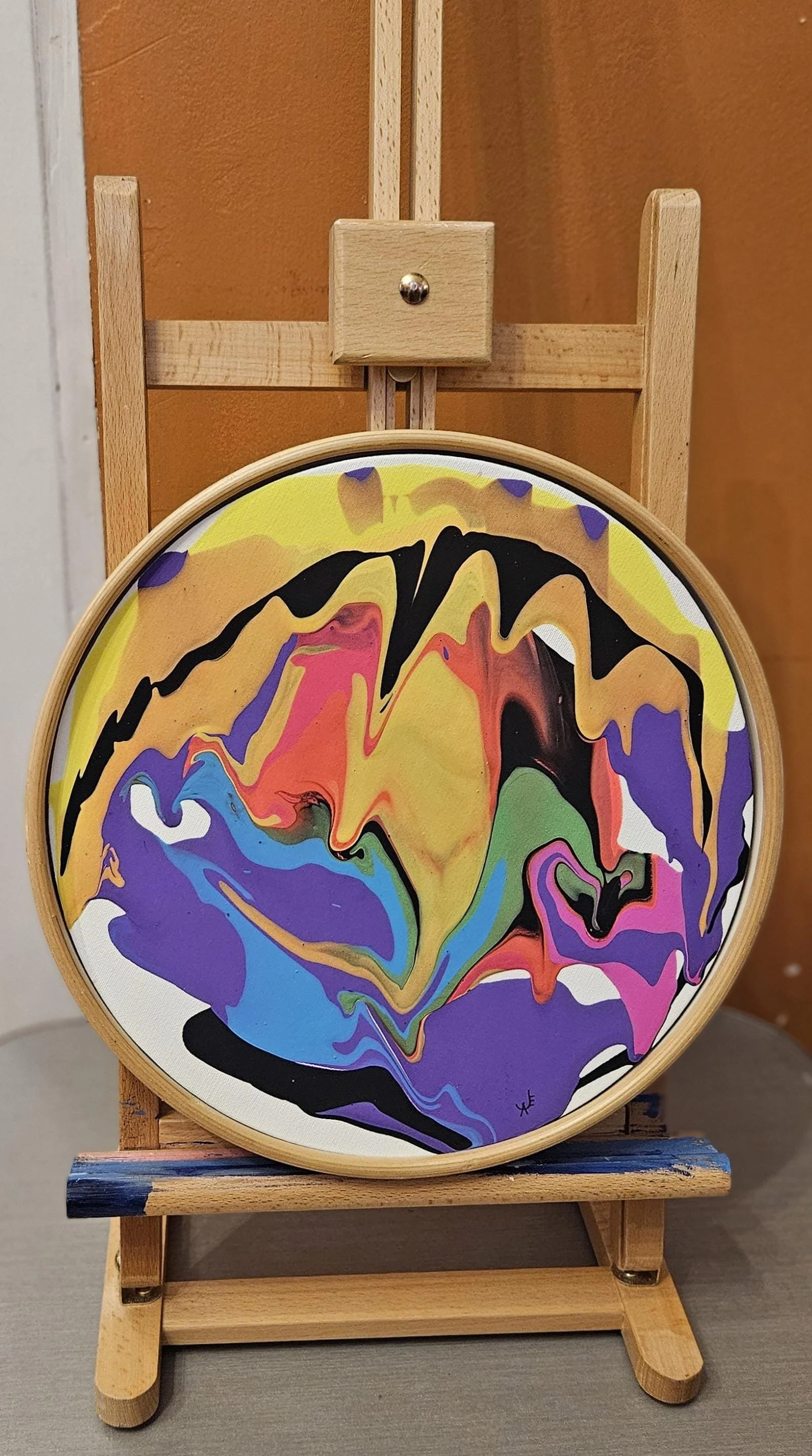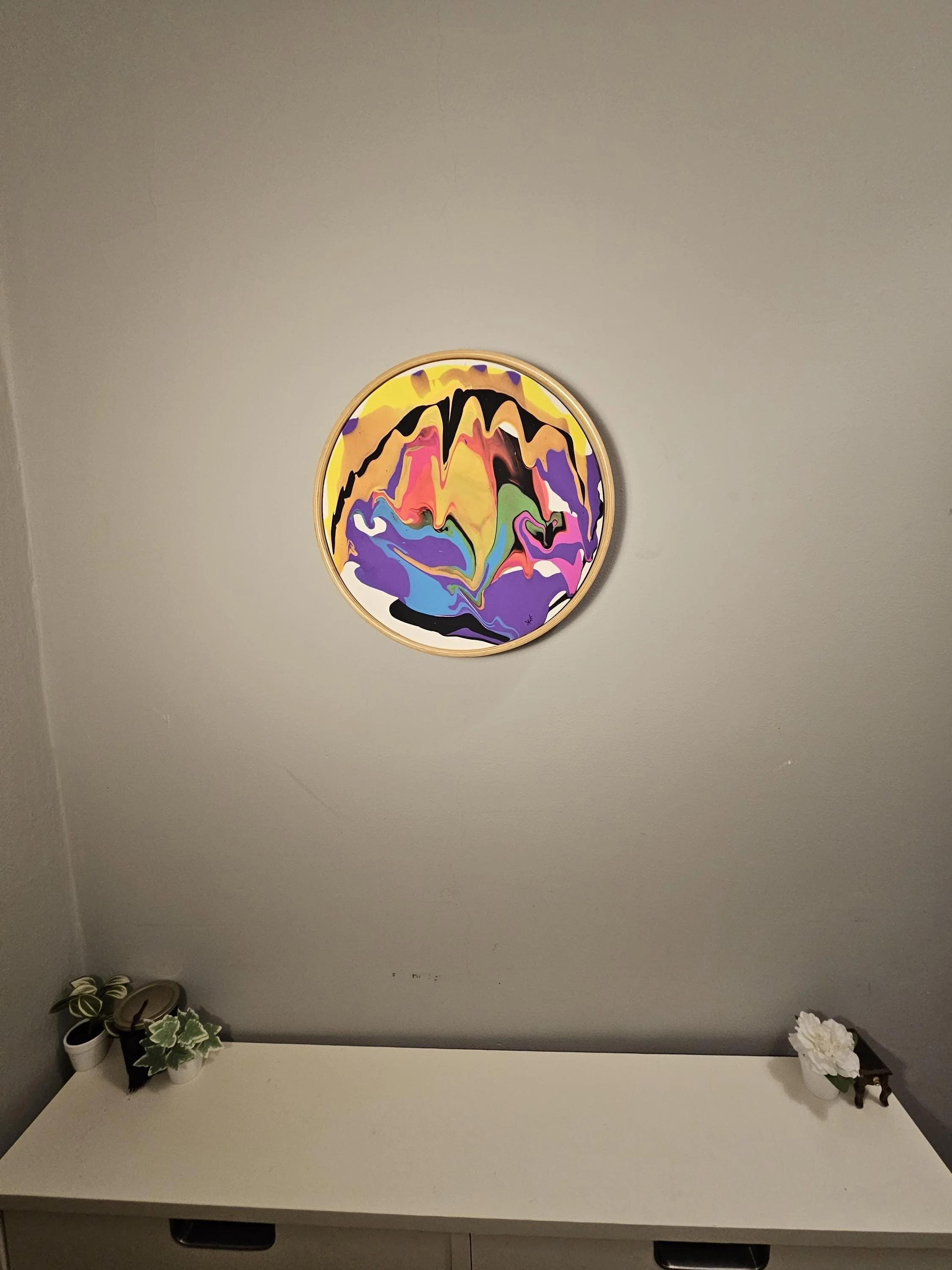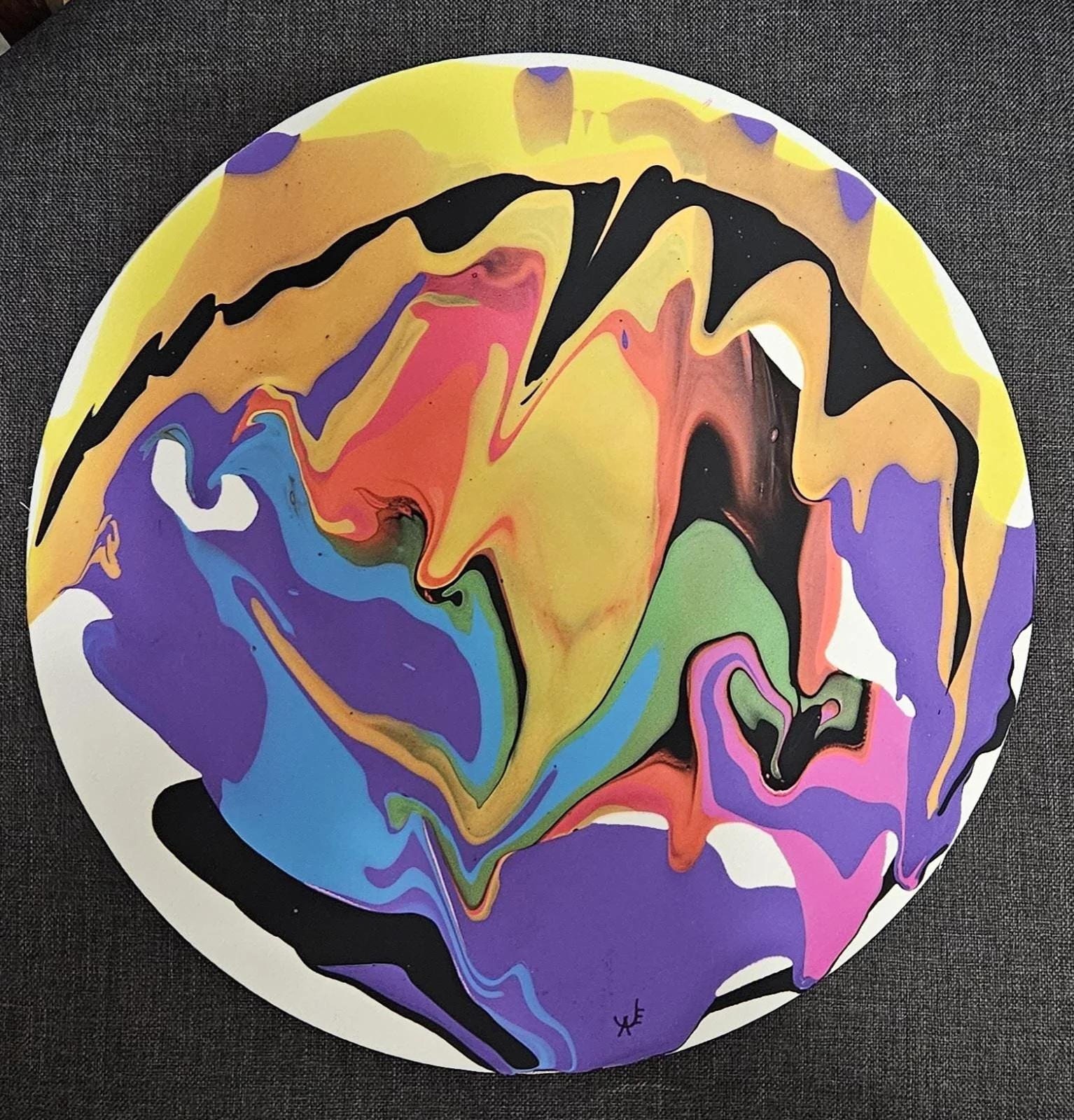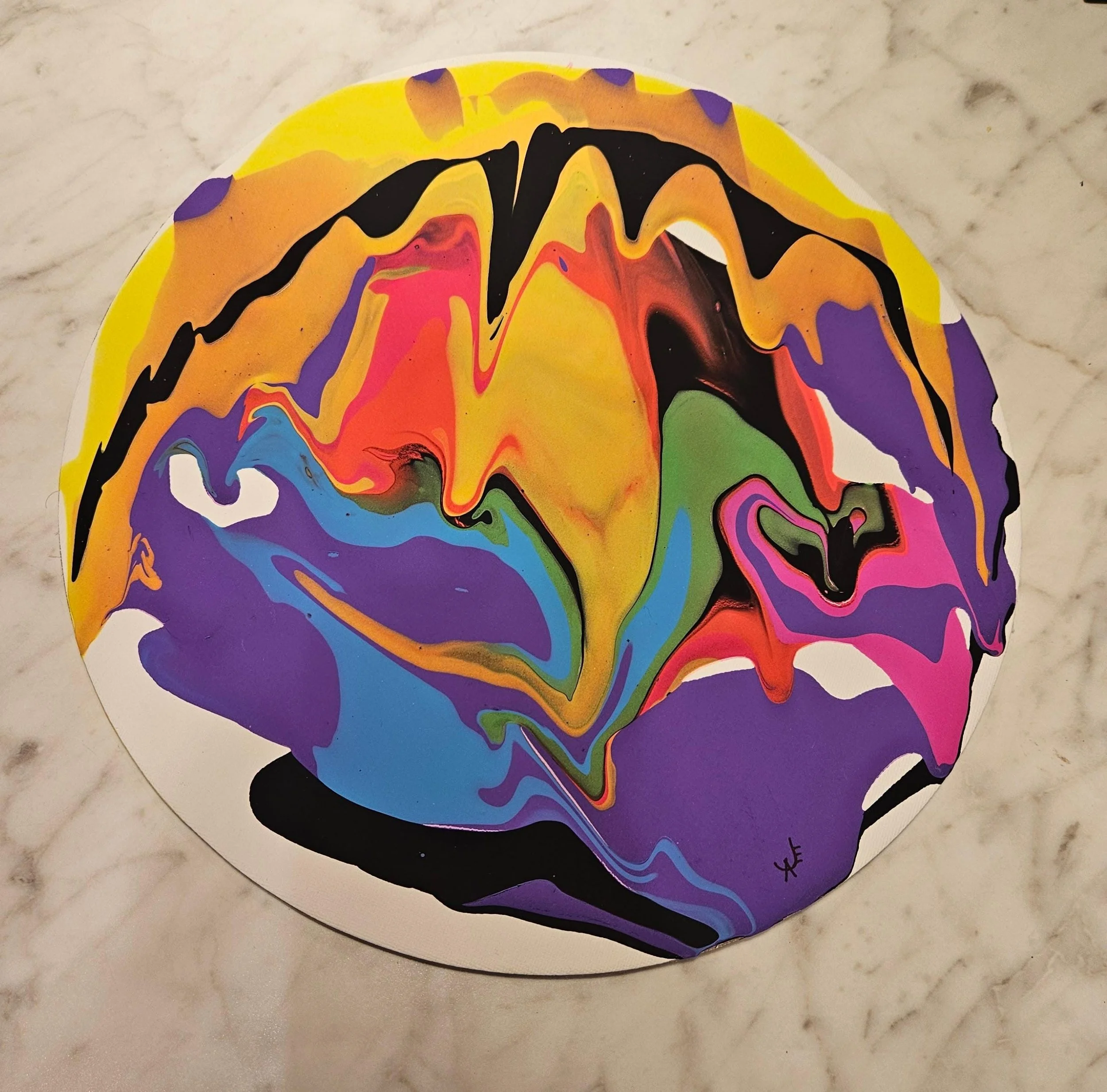 Add a bold statement piece to your space with this one-of-a-kind circular abstract painting! Created using the acrylic pour technique, this artwork bursts with vivid colors, including shades of purple, blue, yellow, orange, pink, black, and green, forming organic, fluid patterns that evoke movement and energy.