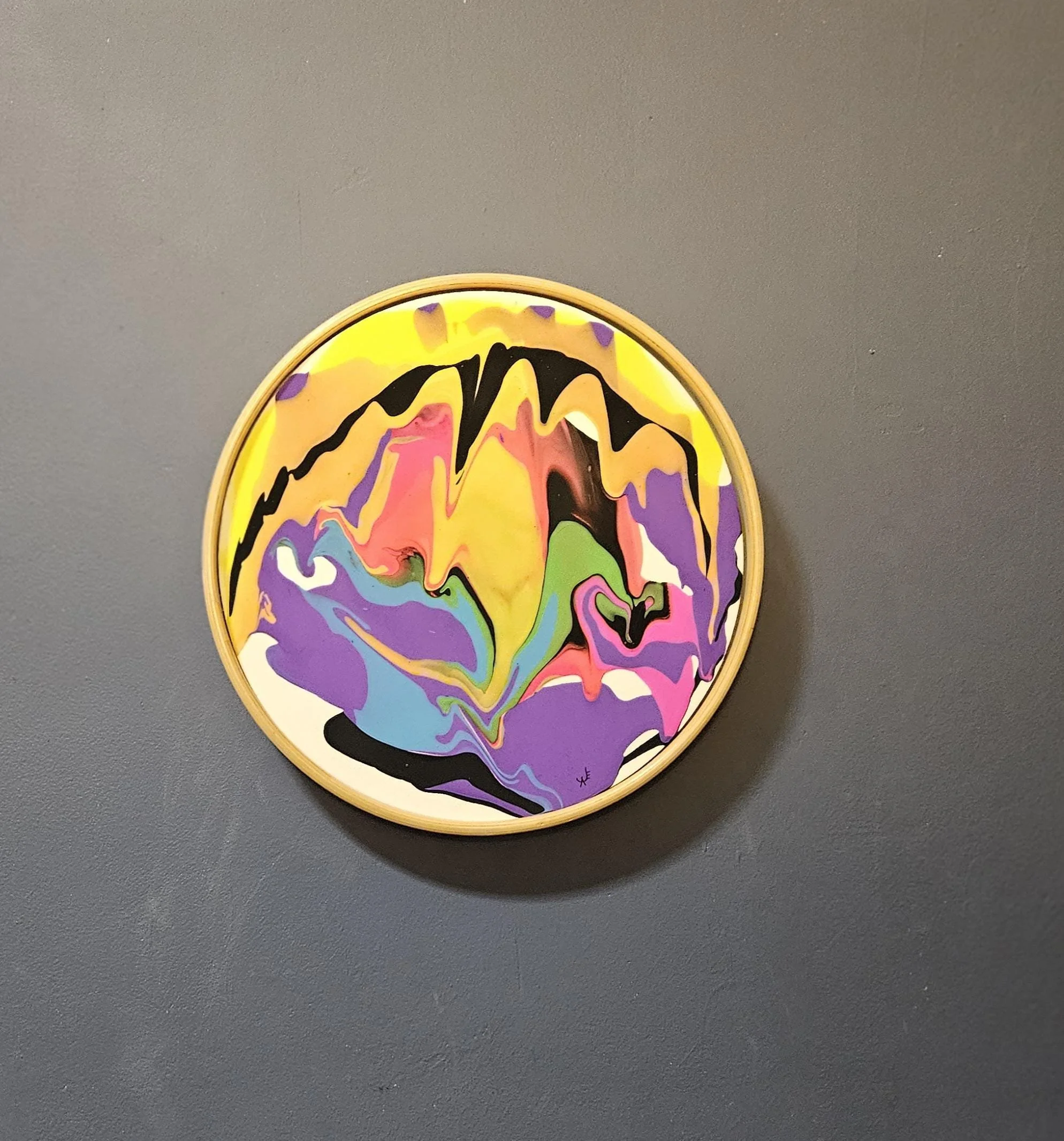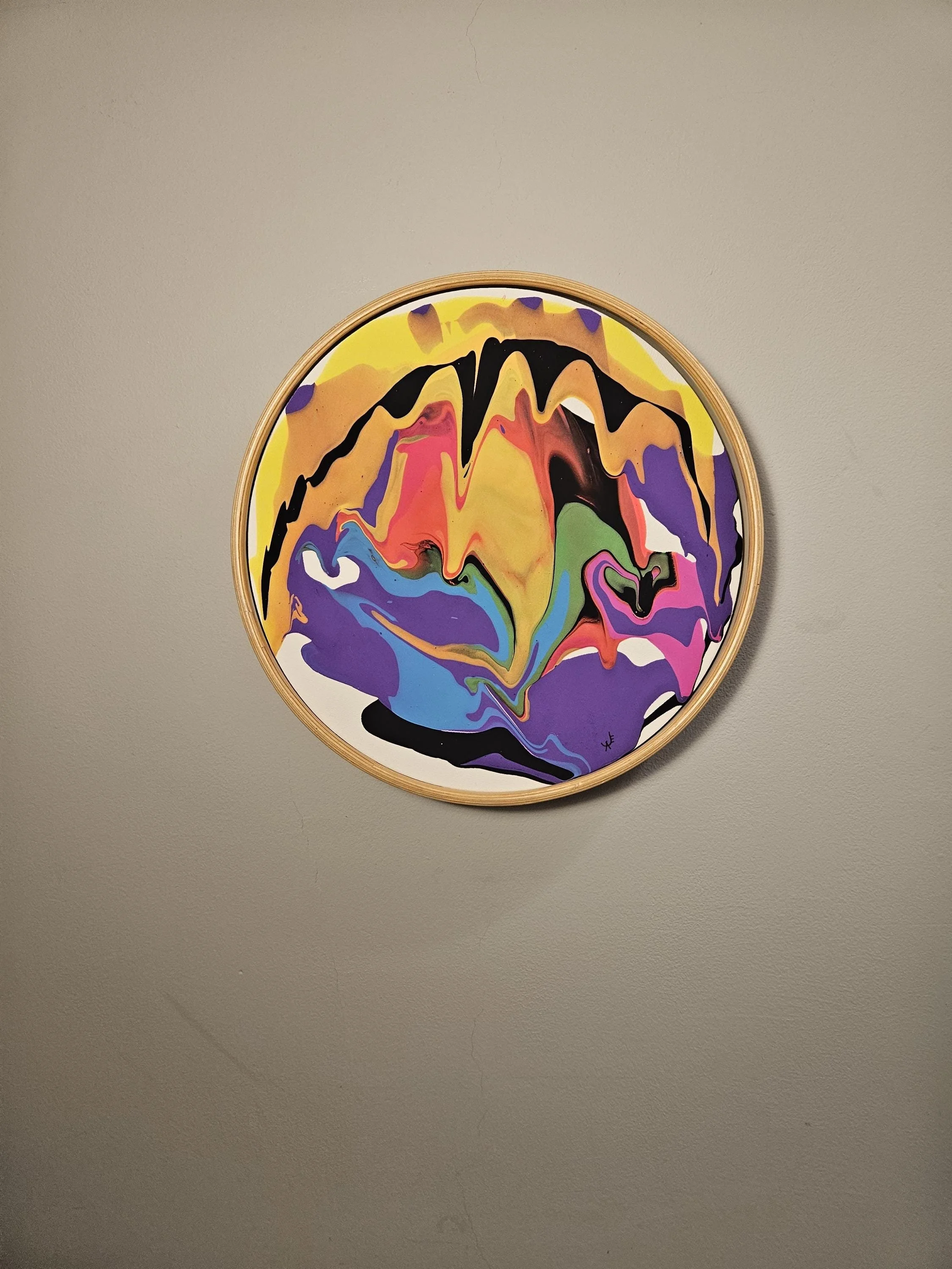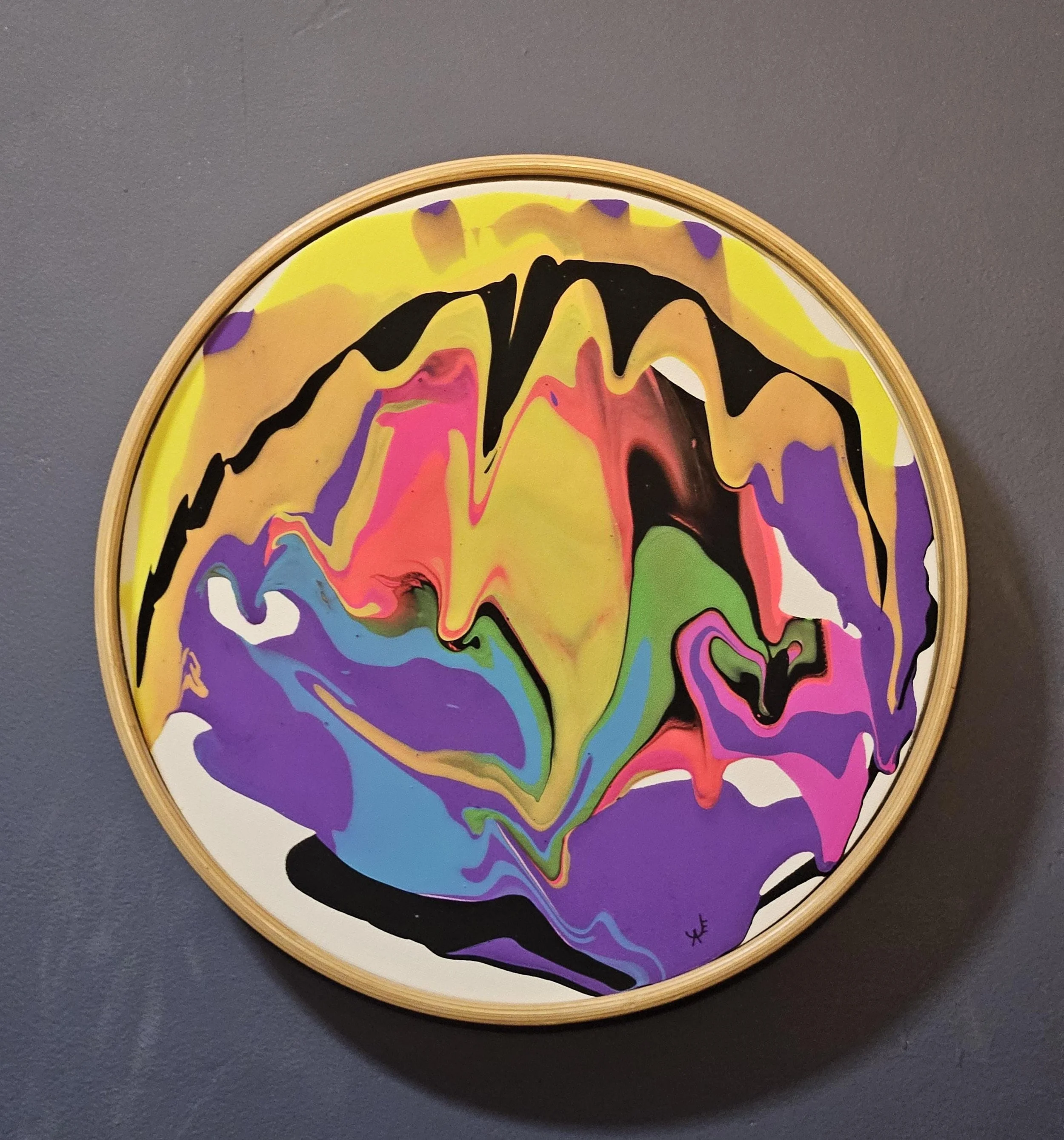 Fluoro Drip- Original acrylic paint pour circle art in a light wood frame measuring 12.5" diameter. Bright colors to add a pop to any space!