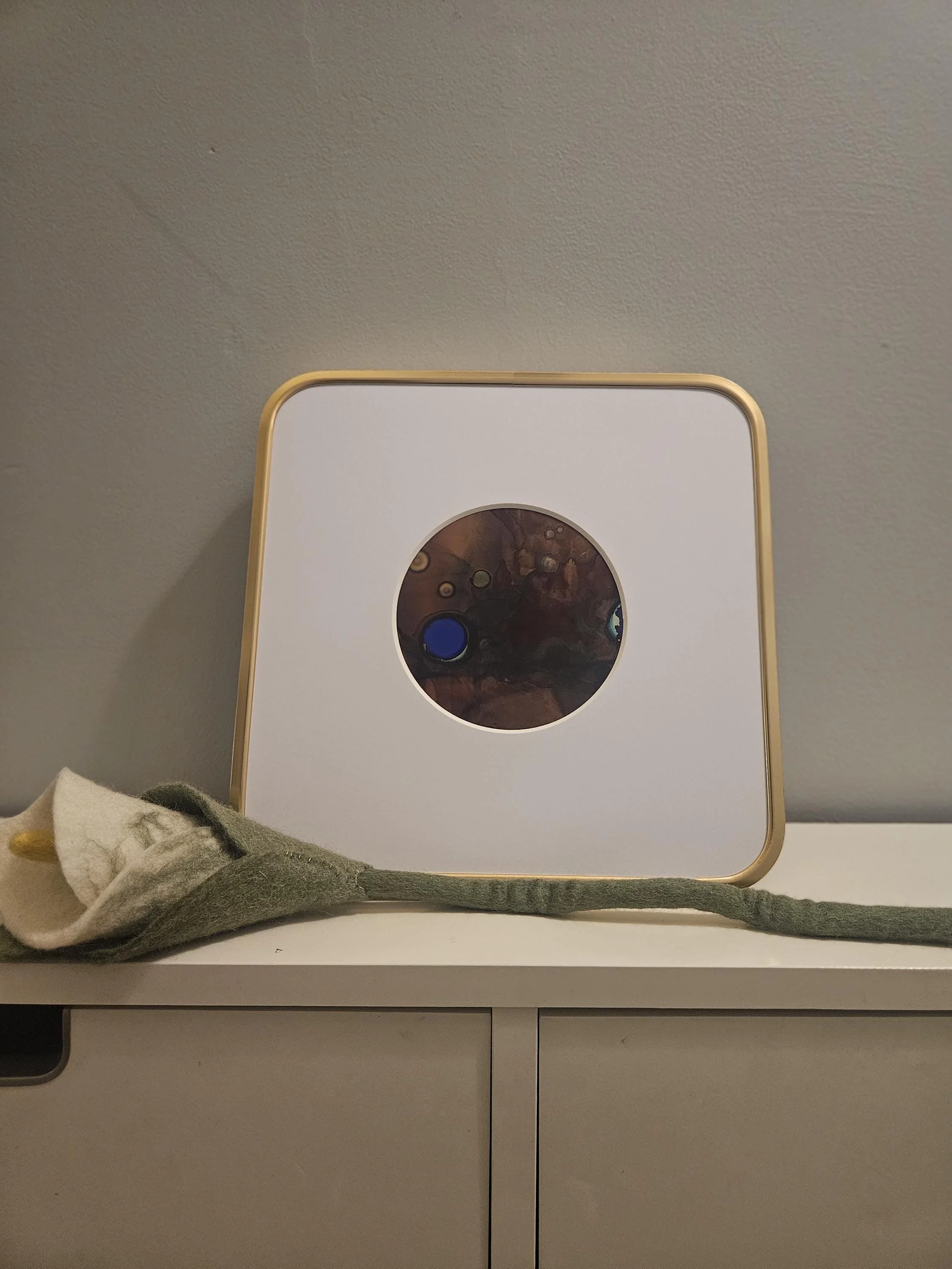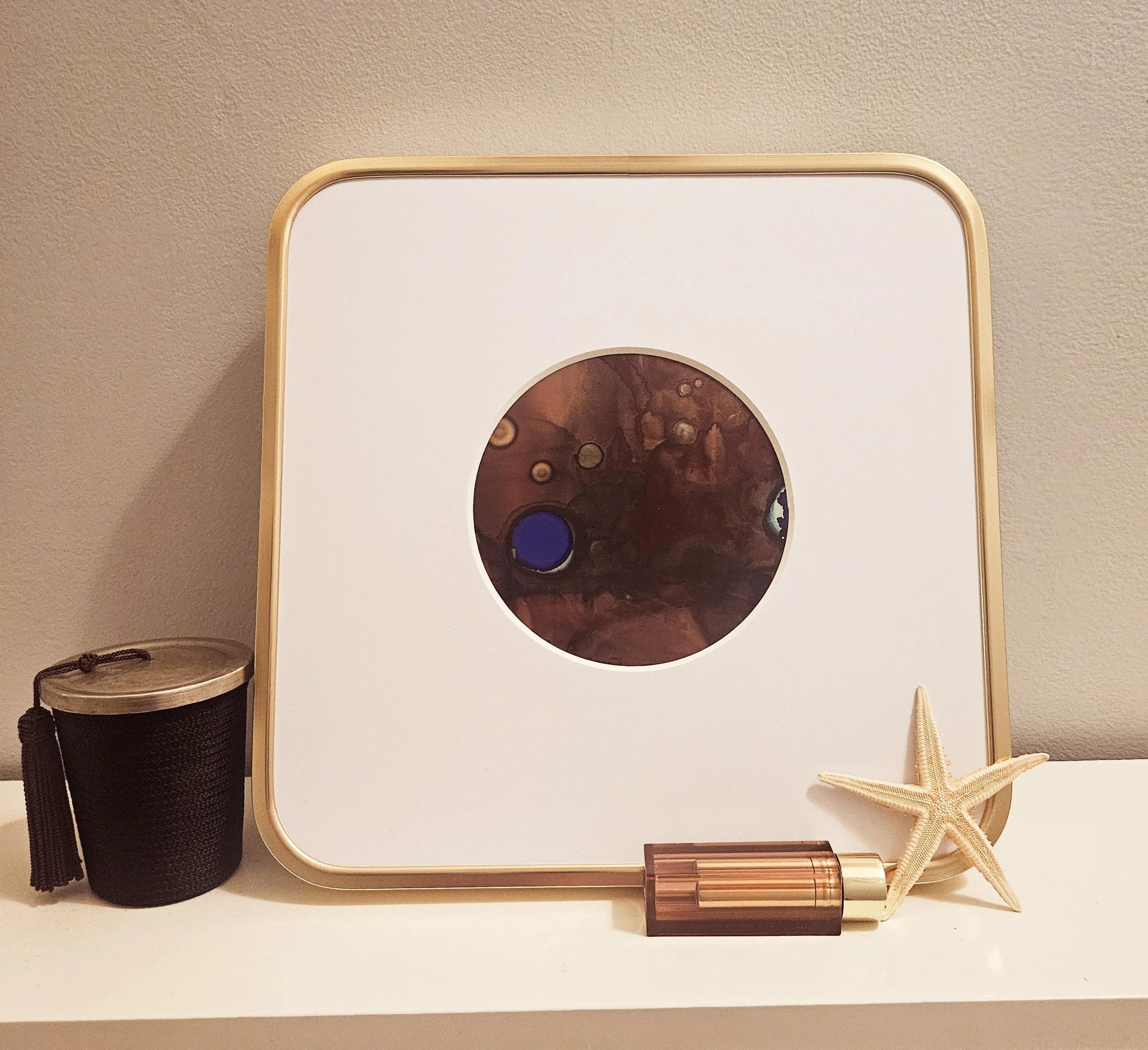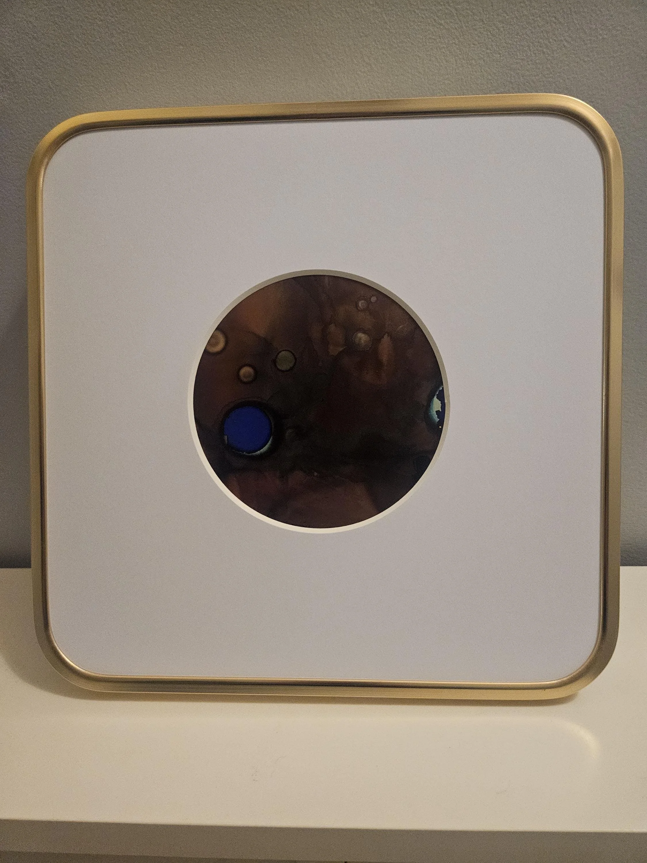 Lapis- original abstract art in square gold frame. Made with alcohol inks, inspired by the lapis lazuli stone. Blue, brown, and green