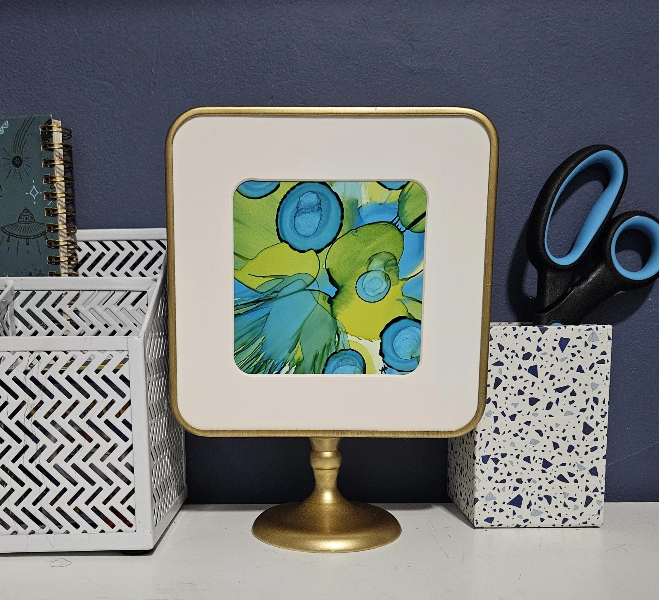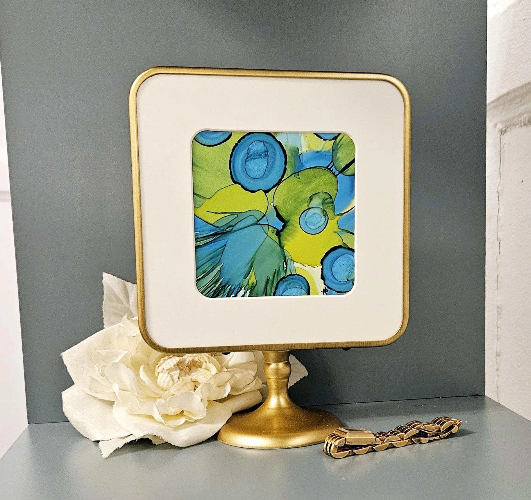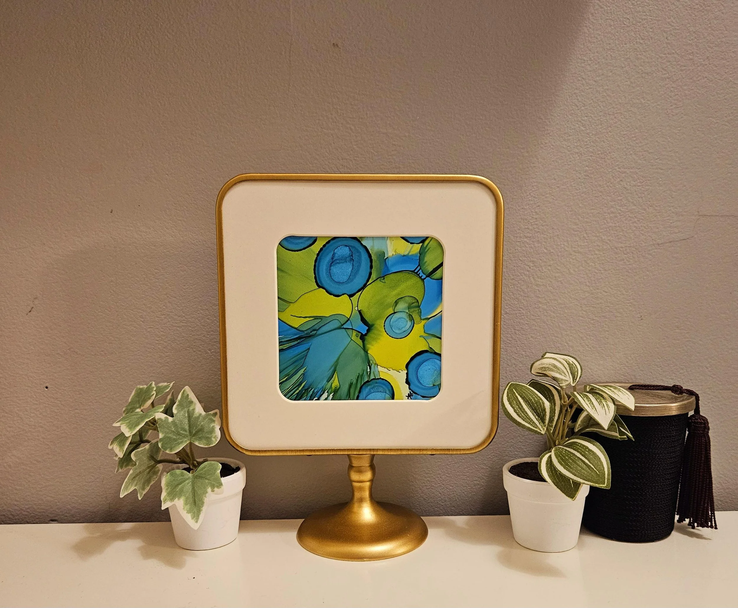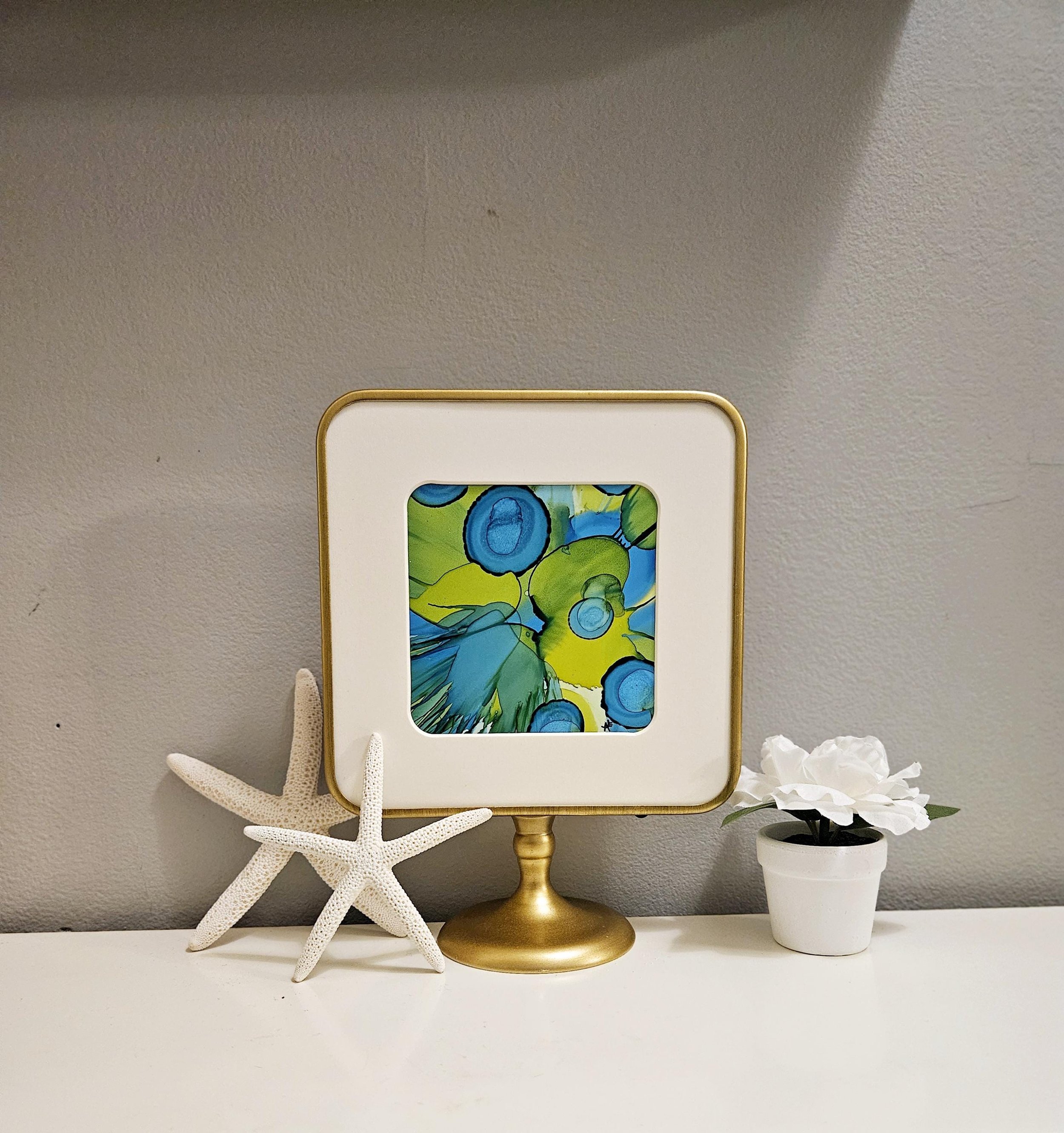 Peacock- Blue & green original alcohol ink painting in brass-colored pedestal frame. Perfect to bring in color (8" height x 6" width)