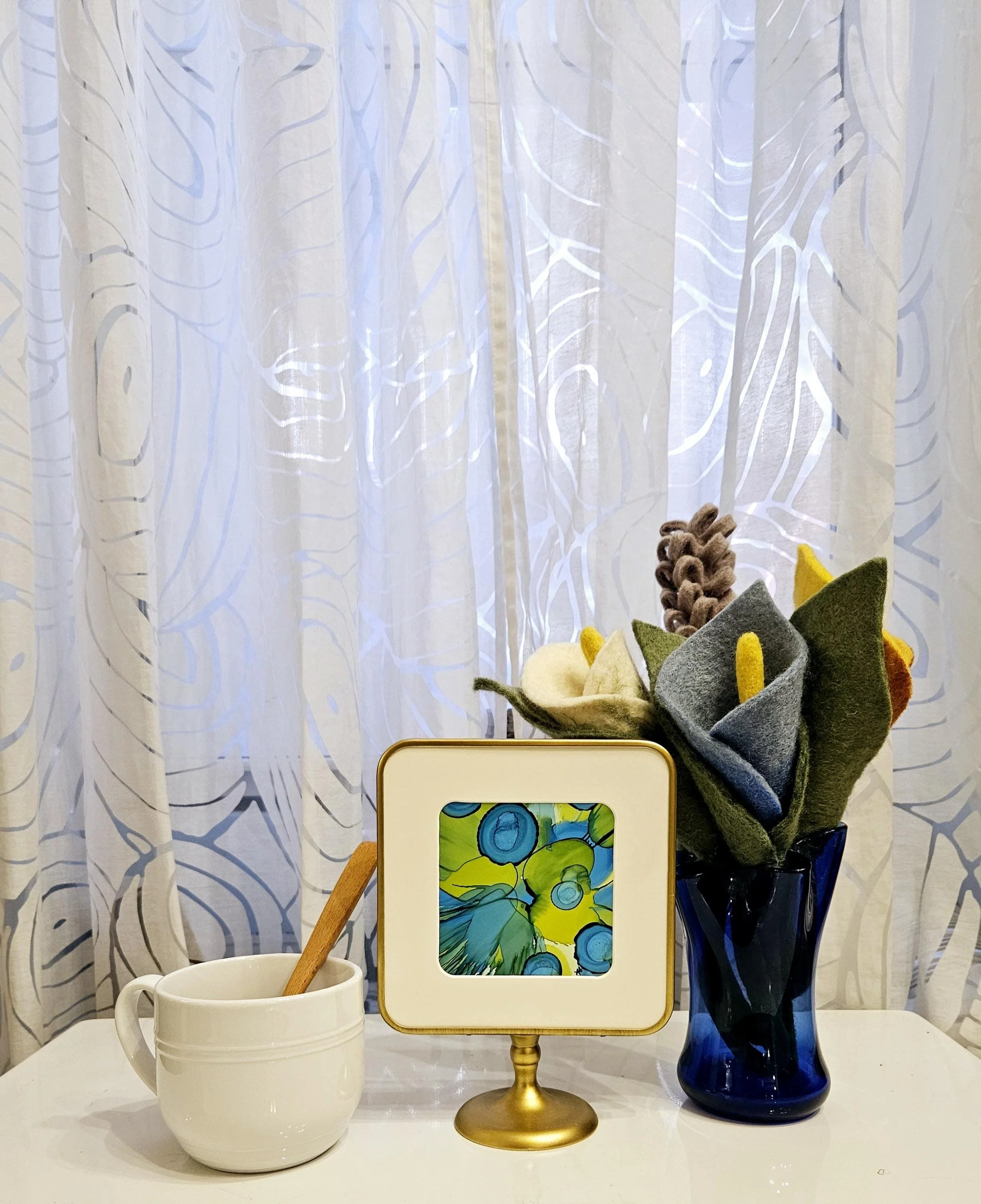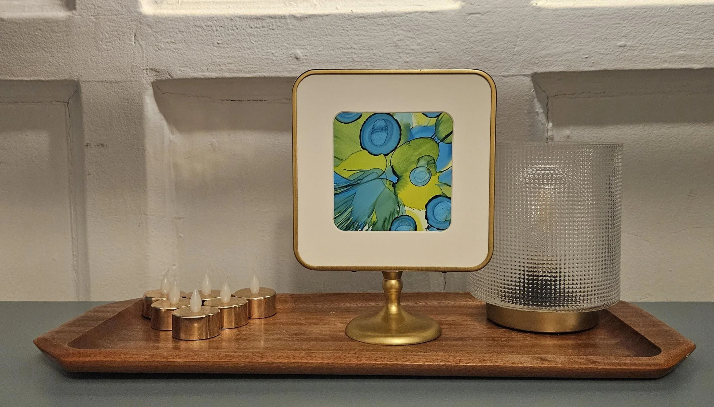 Framed in a pedestal frame with a brass-colored two inch base, this artwork stands out as an elegant decor piece. Measuring 8 inches tall by 6.25 inches wide, it’s the perfect size for a desk, shelf, or counter—anywhere that could use a pop of calming color and artistic charm.