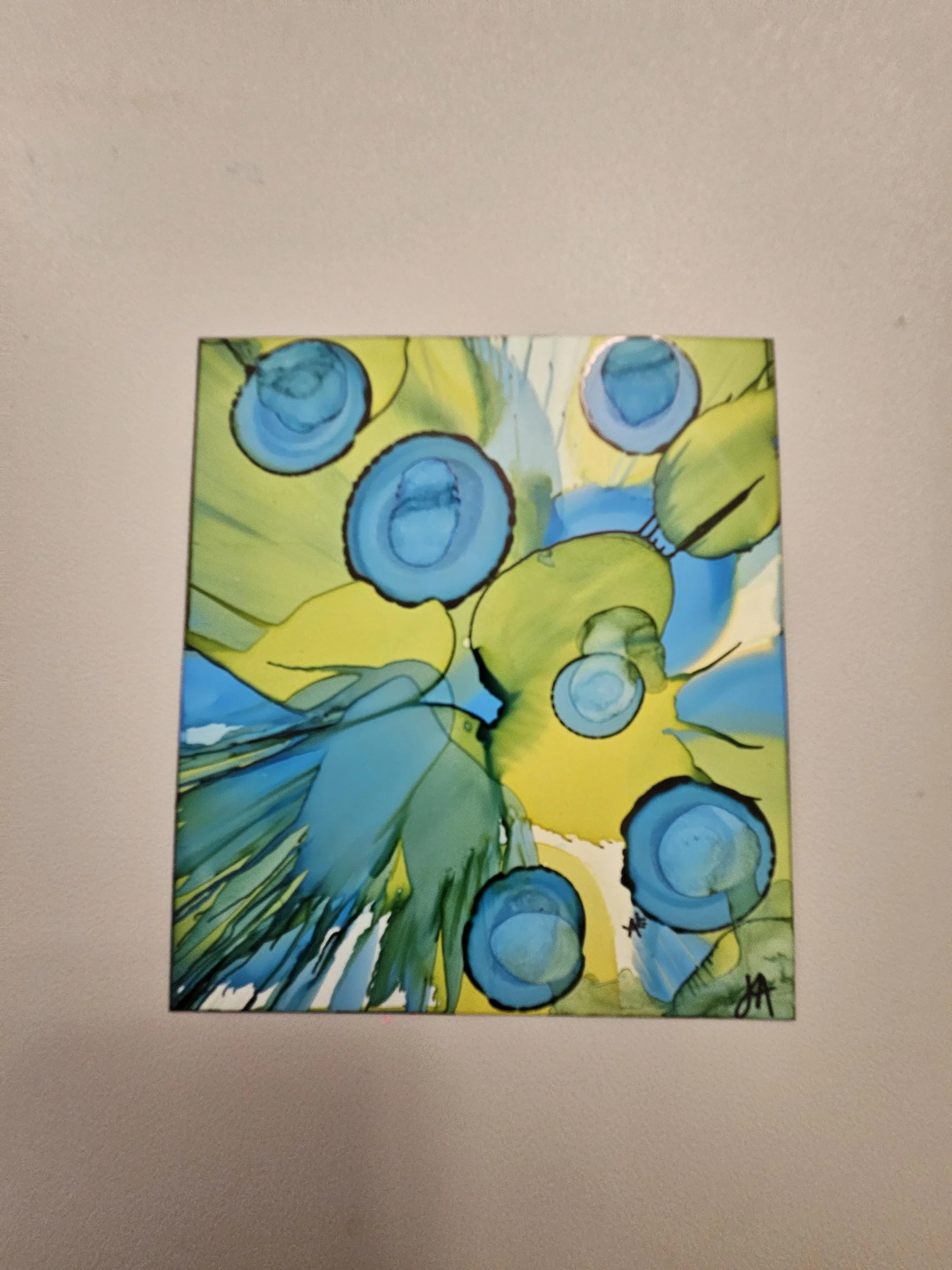 Add a touch of tranquility to your space with this original painting, Peacock, made with alcohol inks in mesmerizing shades of blue and green. Reminiscent of a peacock's feathers, the fluid, organic movement of the colors evokes the serene beauty of nature, bringing a sense of peace and hope to your home or workspace.