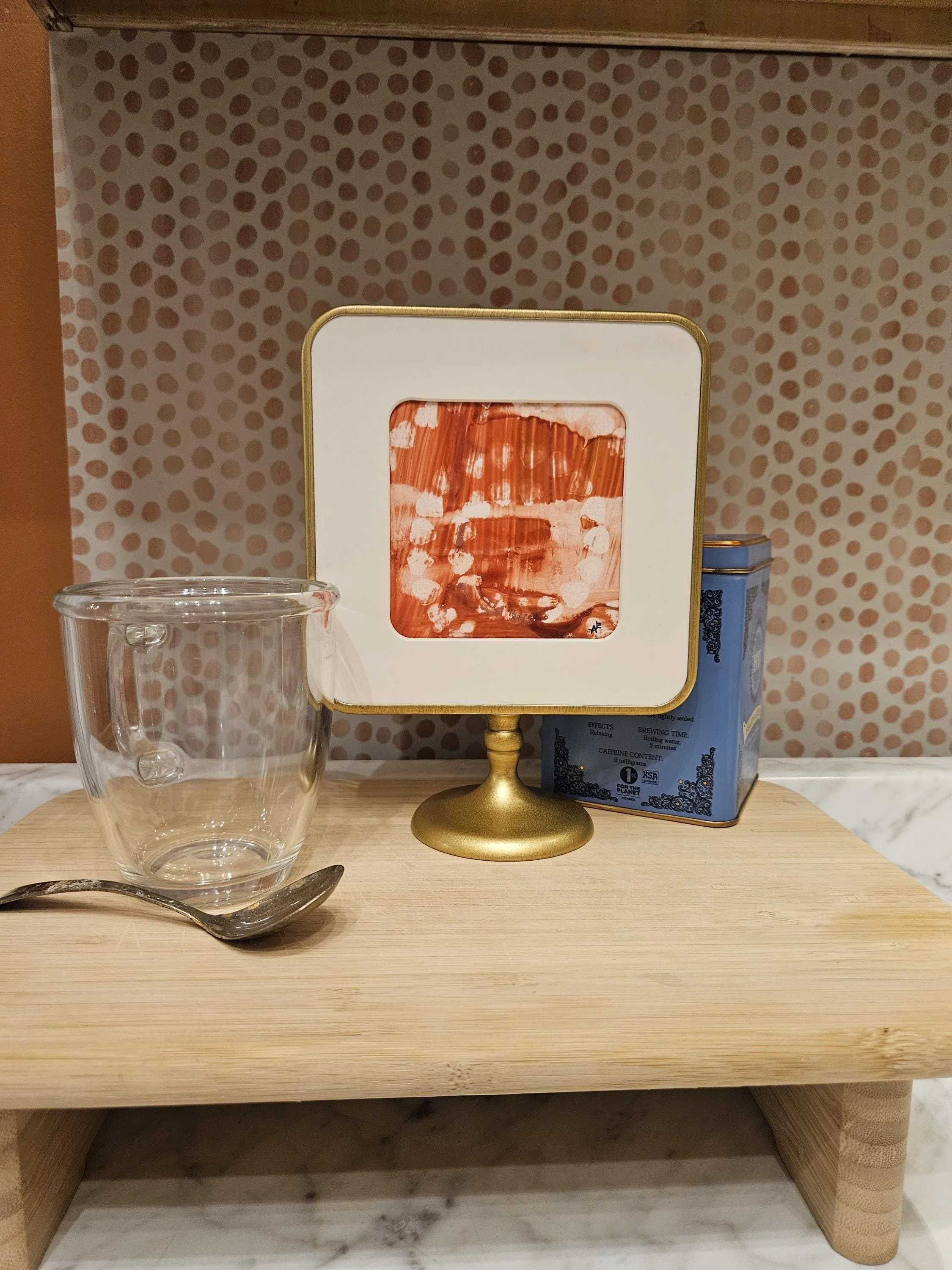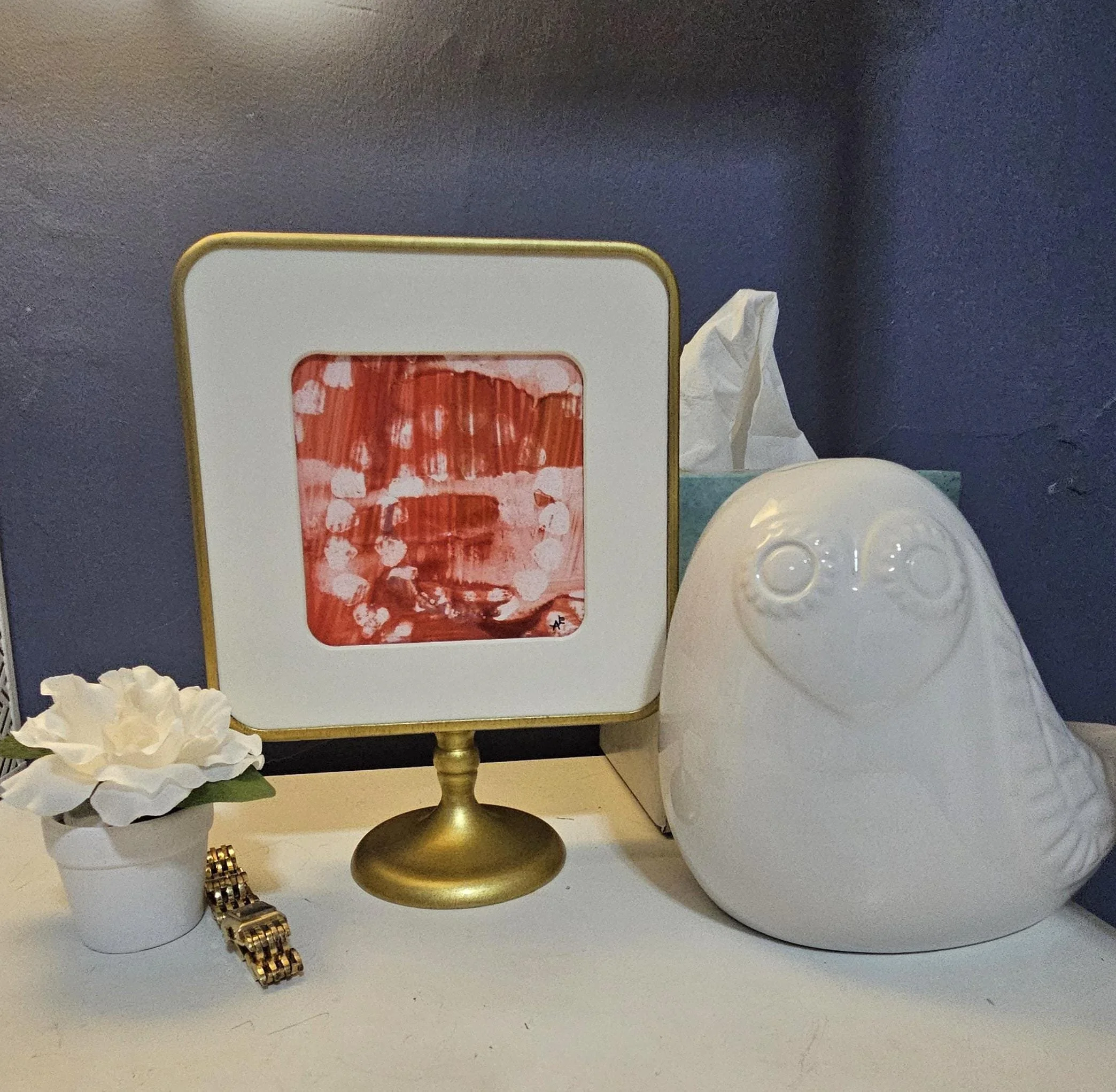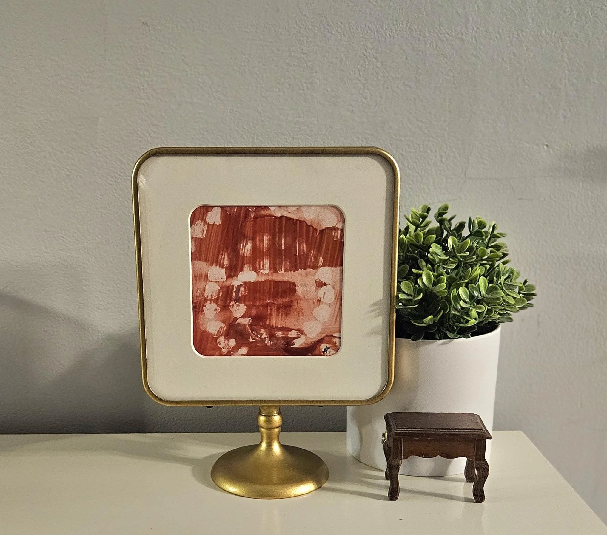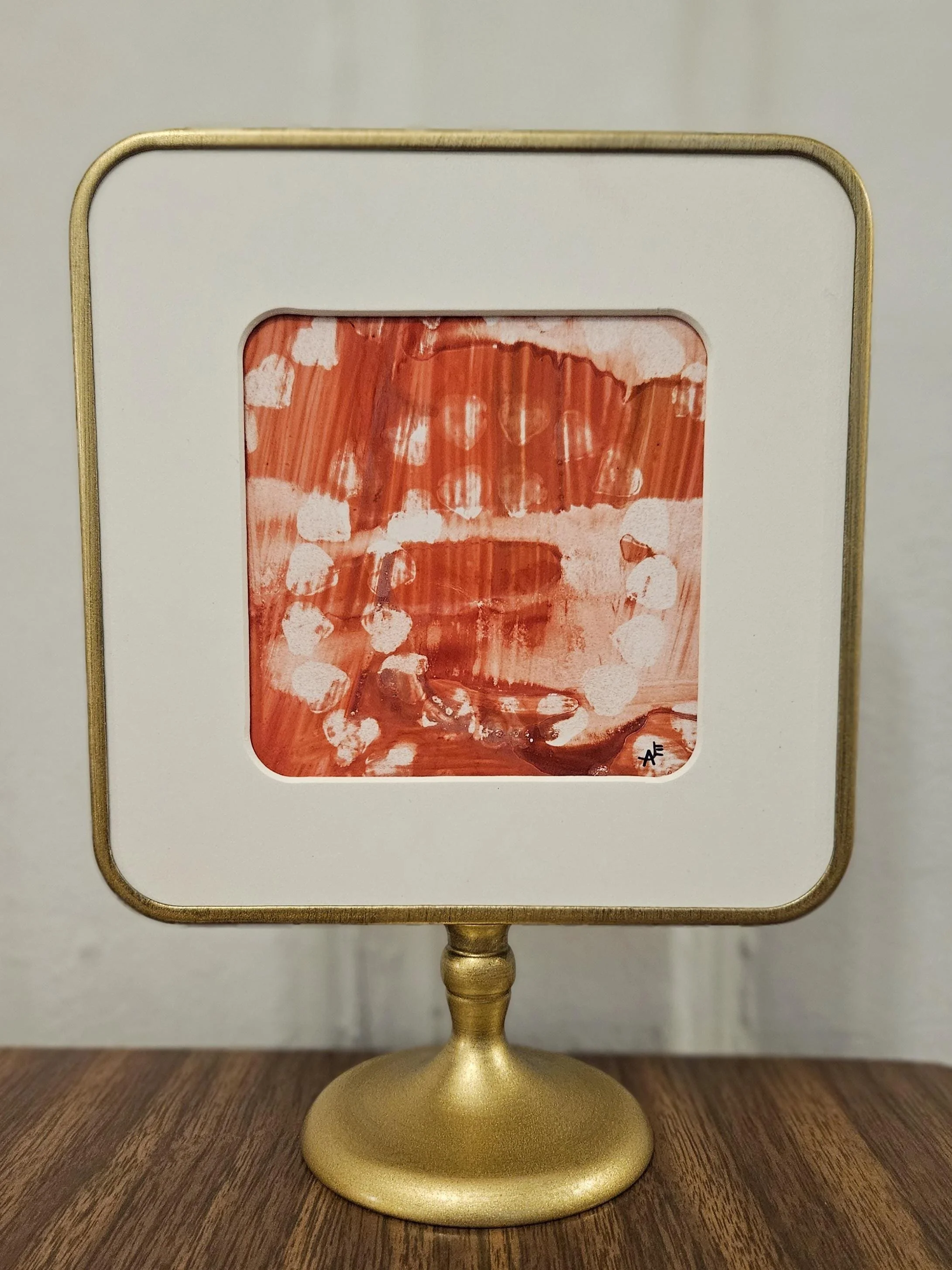 Rosy Resilience- Red, pink, and white original alcohol ink painting in a brass colored pedestal frame. 8 inches tall, 6 inches wide.