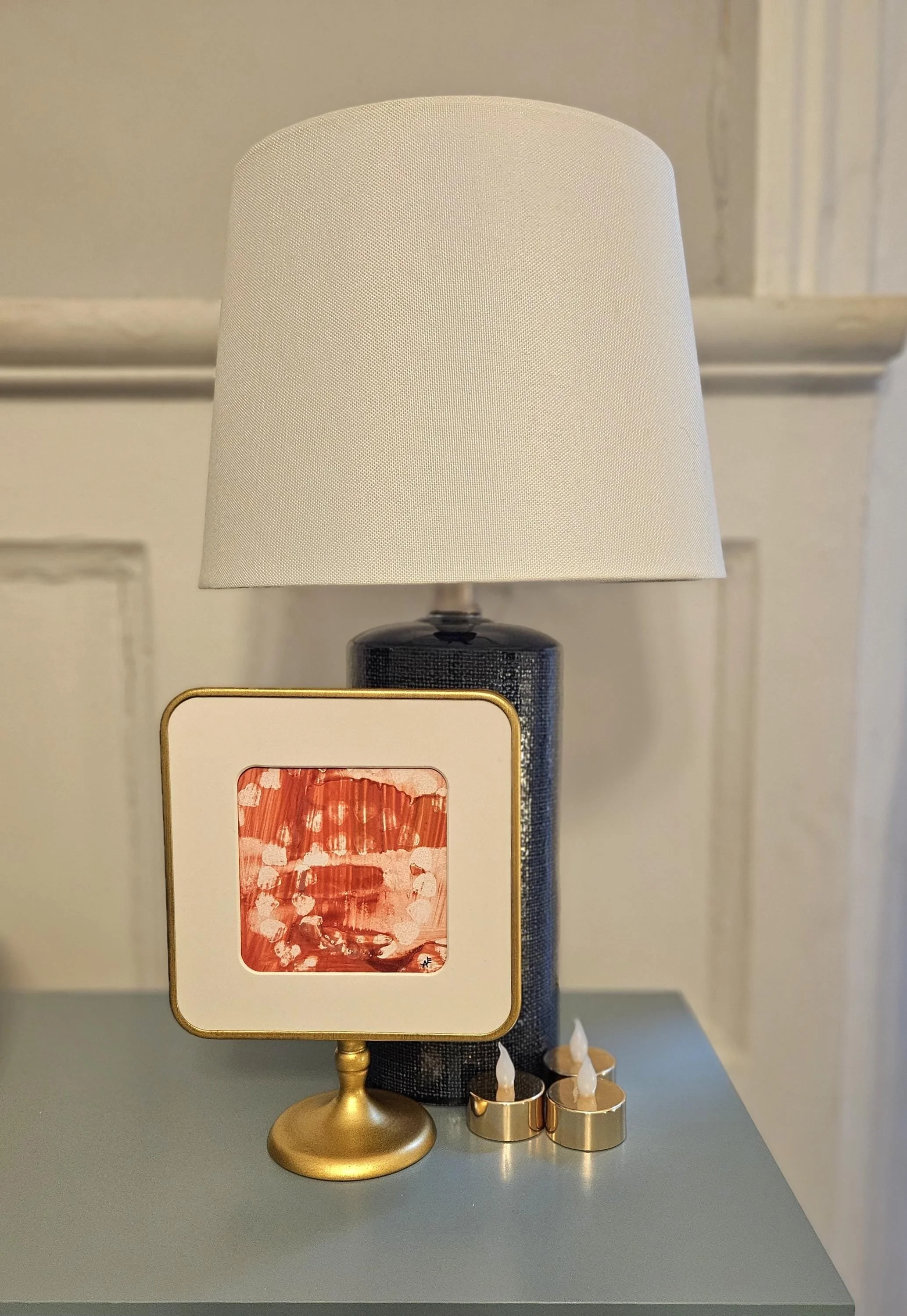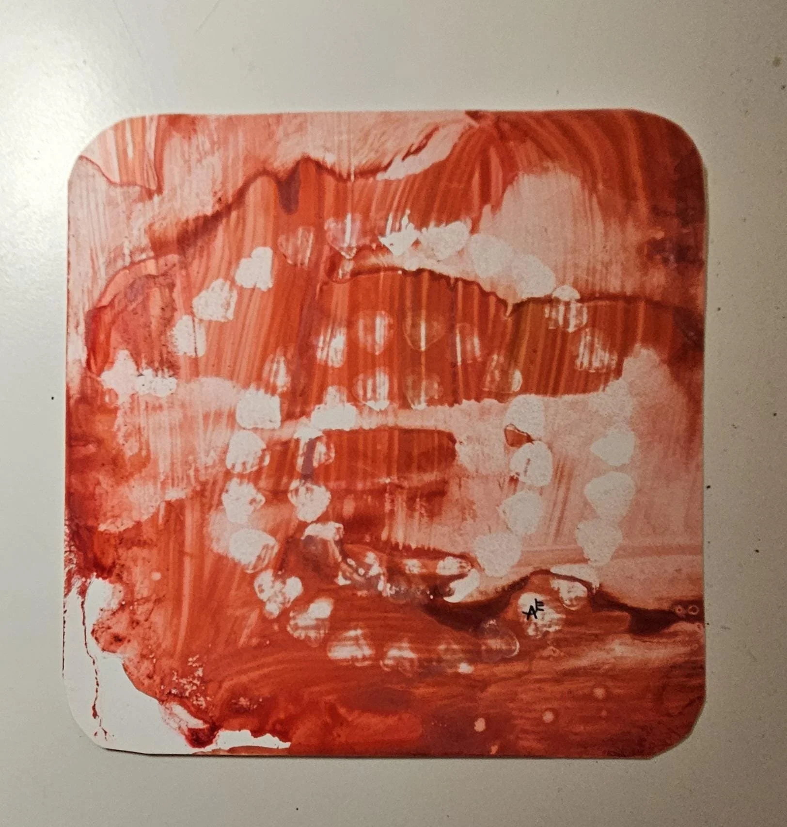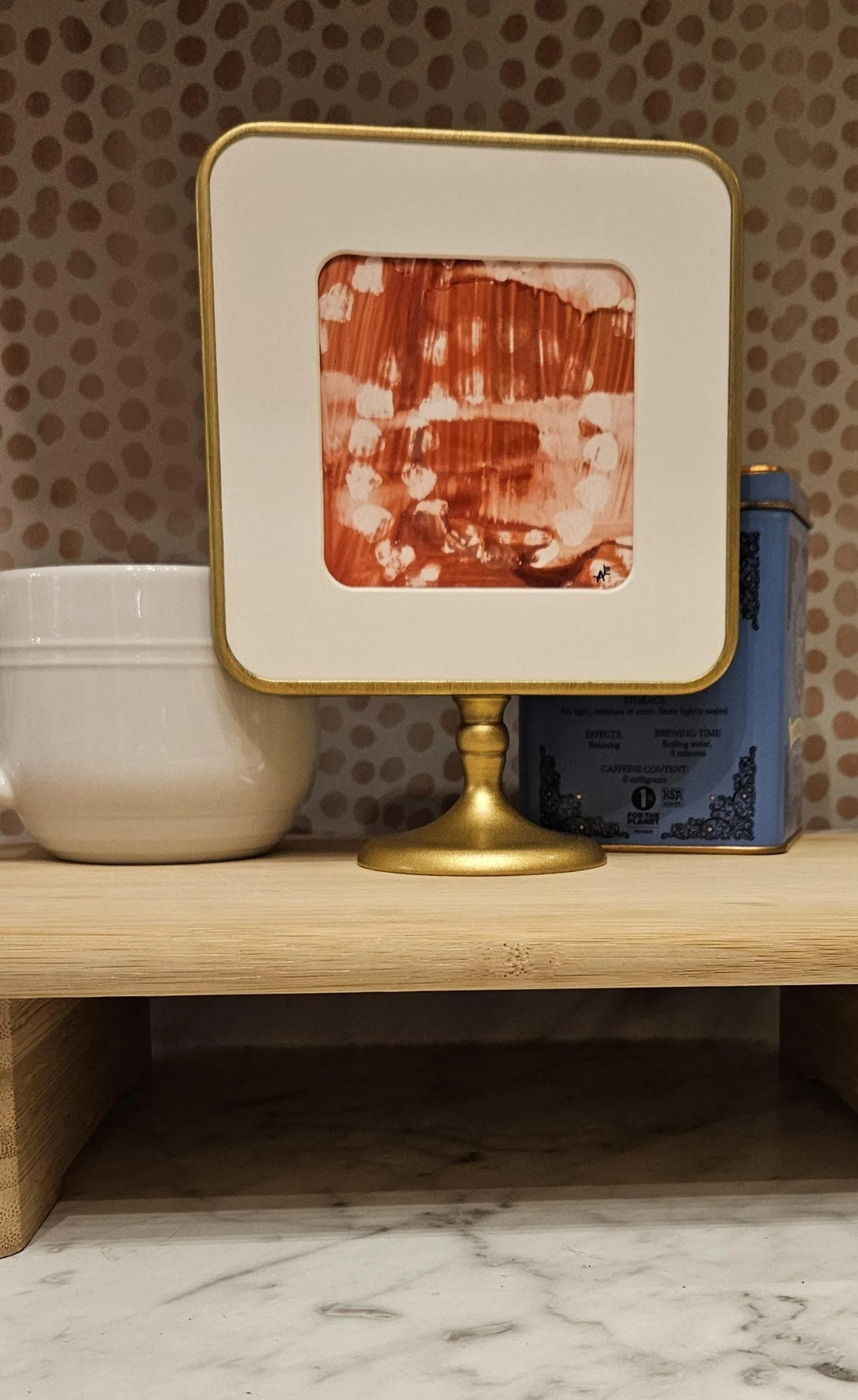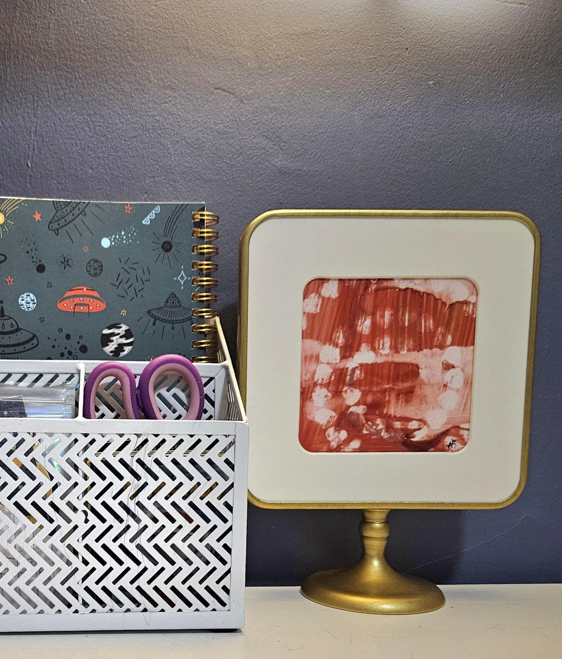 Rosy Resilience- Red, pink, and white original alcohol ink painting in a brass colored pedestal frame. 8 inches tall, 6 inches wide.