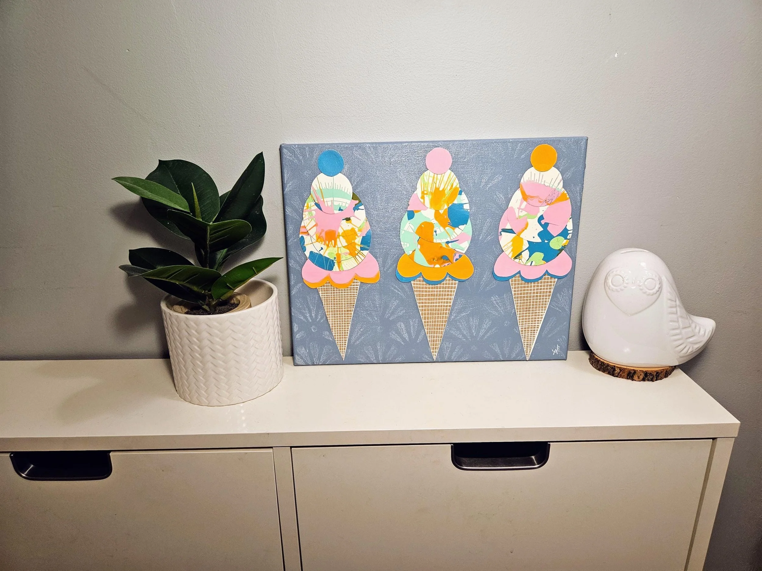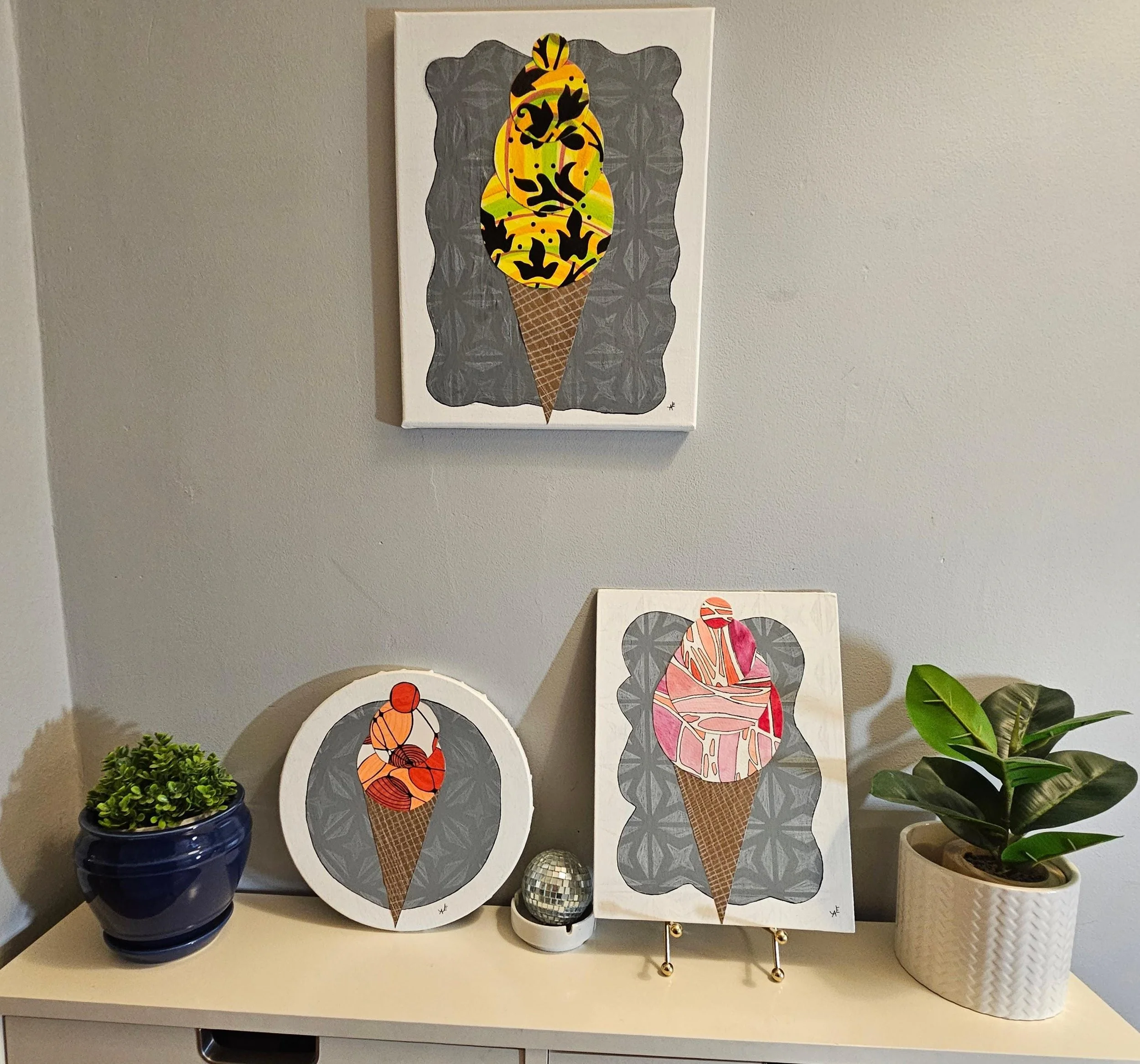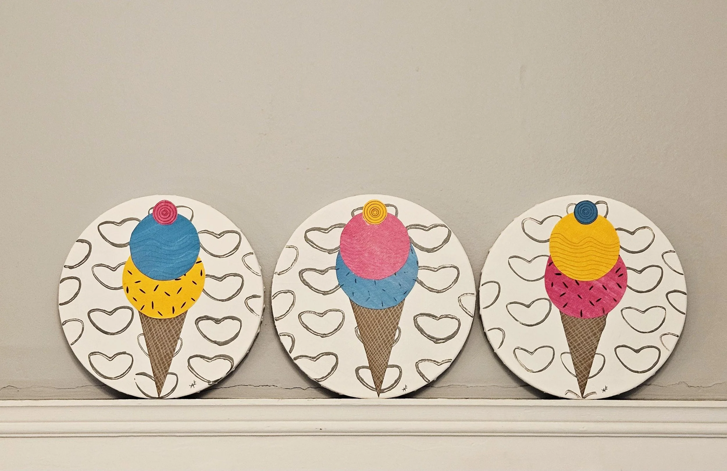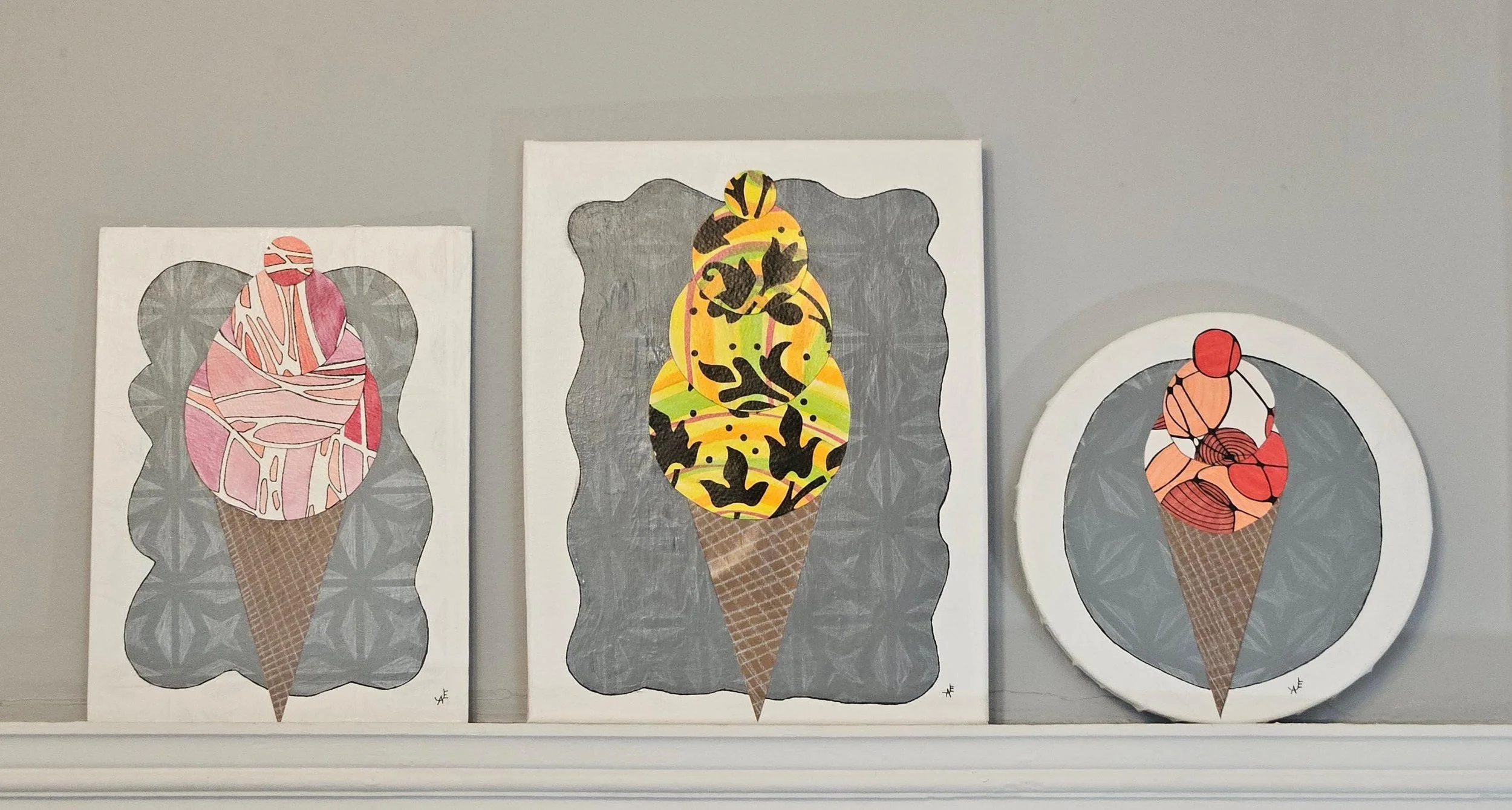 The Sweet Scoop Series Categories: Select a Category Alcohol Ink The Sweet Scoop Series Acrylic paintings Paint Pour Spin Art The Sweet Scoop Series The Triple Treat- Three Ice Cream shaped, original art on circle canvas- 10 inch diameter-ready to hang-colorful art- bedroom, kitchen, etc. $300.00 Add To Cart Added! Sugar & Swirl- original art- Ice Cream Cones on a rectangular canvas (14 inch width x 11 inch height) Fun, whimsical, kid's rooms, kitchens $150.00 Add To Cart Added! The Cone and Color Club-Three paintings of Ice Cream Art (2 rectangle-11"x14" & 9"x12", a 10"circle) sold as a set-fun, whimsical, nostalgia $300.00 Add To Cart Added! Have Questions?Fill out the info or email me at joyeahern@gmail.com, and I’ll get back to you as soon as I can.